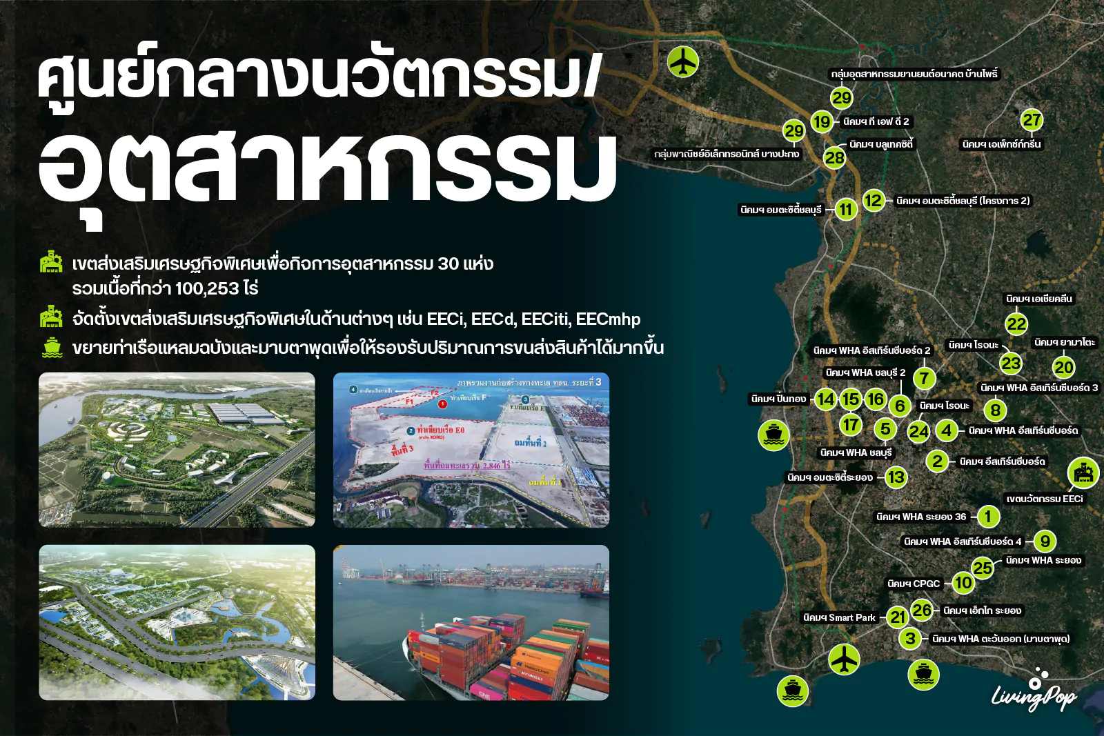 ซึ่งที่ผ่านมาหลายบริษัทระดับโลกได้มาปักหมุดลงทุนแล้ว และคงมีมาเพิ่มอีกเรื่อยๆ ในอนาคตฮะ นอกจากนี้ยังมีการพัฒนาท่าเรือขนส่งสินค้าเพื่อให้รองรับปริมาณการขนส่งที่เพิ่มขึ้นด้วย โดยใน EEC จะมีท่าเรืออยู่ 2 ท่าหลักๆ คือท่าเรือแหลมฉบังที่เน้นขนส่งยานยนต์และสินค้าที่เป็นตู้คอนเทนเนอร์ และท่าเรือมาบตาพุดที่จะเน้นน้ำมัน ก๊าซธรรมชาติ และผลิตภัณฑ์ปิโตรเคมีครับ โดยปัจจุบันทั้ง 2 ท่าอยู่ระหว่างการถมทะเลเพื่อต่อขยายพื้นที่ท่าเรือใน Phase ที่ 3 ครับ