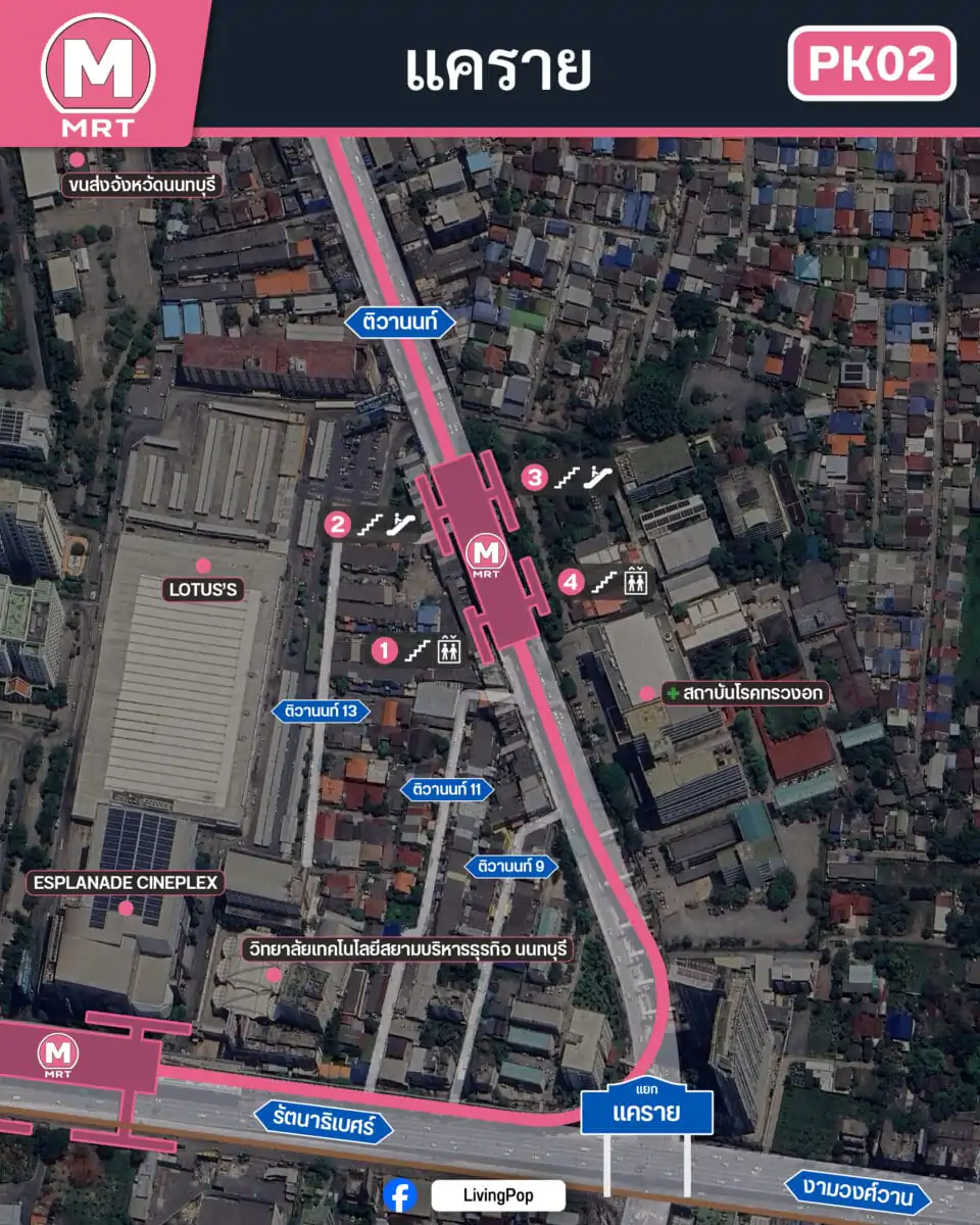 สถานีจะตั้งอยู่บนถนนติวานนท์ ห่างจากแยกแครายไปทางทิศเหนือประมาณ 320 เมตรครับ โดยจะตั้งอยู่หน้าสถาบันโรคทรวงอก และใกล้กับทางเข้าห้าง Lotus’s แครายฝั่งติวานนท์
