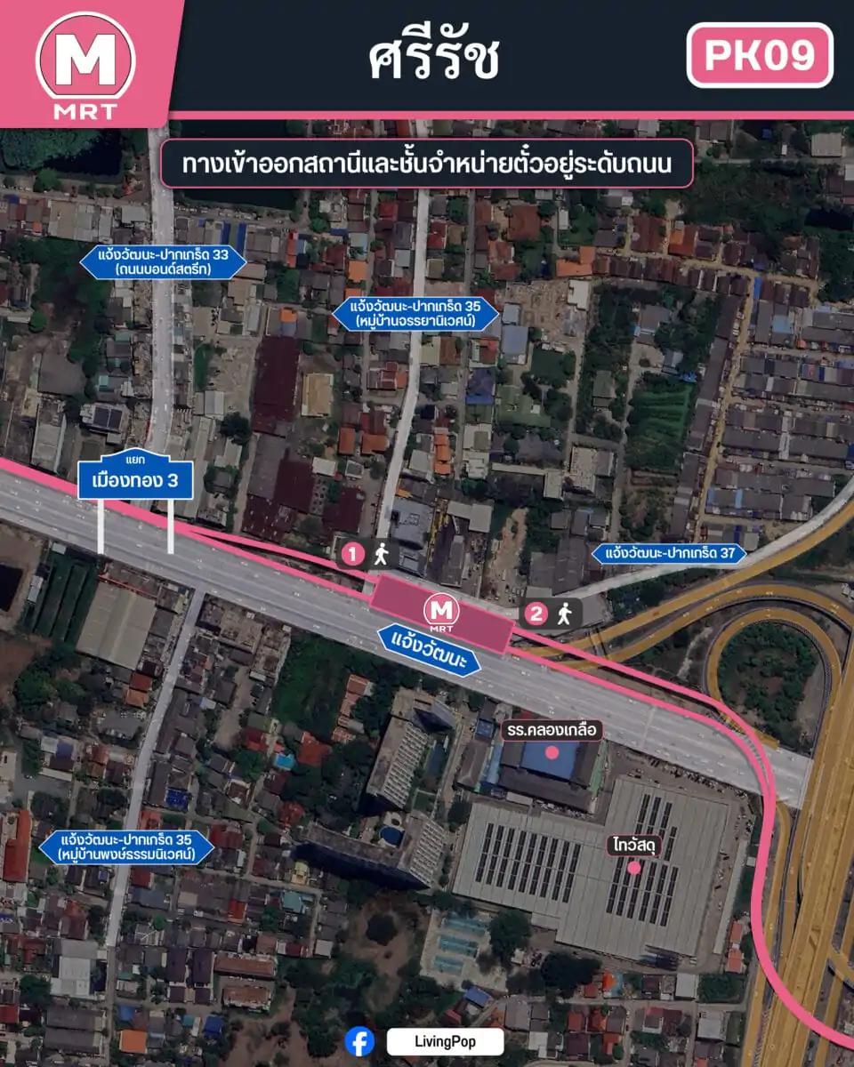 นอกจากนี้ใครที่ติดตามความคืบหน้าของสายสีชมพูมานาน จะสังเกตว่ามีการเปลี่ยนชื่อสถานีด้วย เดิมทีสถานีนี้ชื่อว่า “สถานีเมืองทองธานี” เพราะตั้งอยู่ใกล้กับปากทางเข้าหมู่บ้านเมืองทอง แต่เพื่อไม่ให้เกิดความสับสนกับสถานี PK10 ที่อยู่ถัดไป ซึ่งจะเป็นสถานีเชื่อมต่อกับสายแยกที่เข้าไปใน IMPACT เมืองทองธานีโดยตรง ก็เลยมีการ “สลับชื่อสถานีกัน” เอาชื่อสถานีศรีรัชมาไว้ตรงนี้แทนนั่นเองครับ 😅