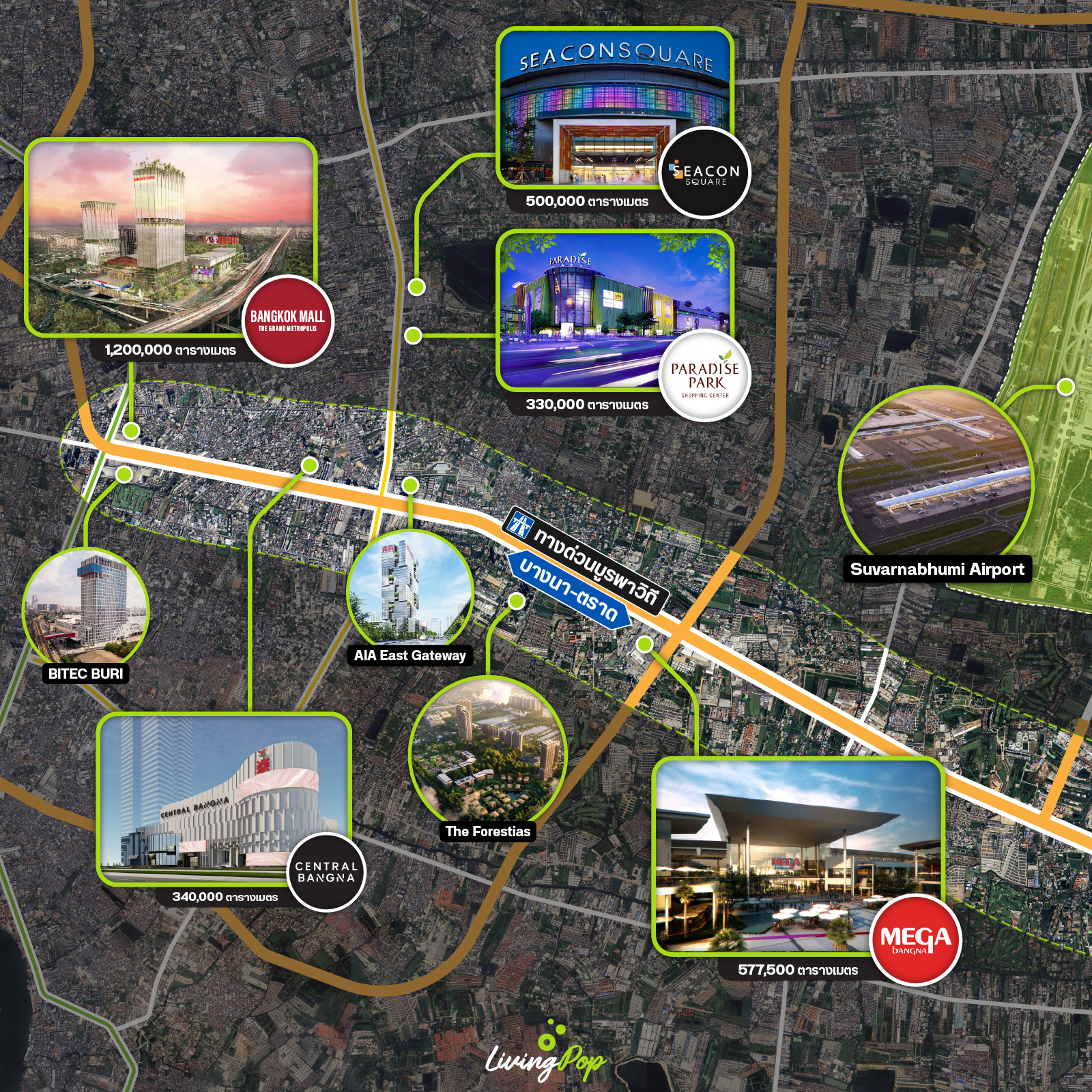 ซึ่งนอกจากนี้ยังเป็นที่ตั้งของโปรเจกต์ Mixed-use ขนาดใหญ่อีกหลายโครงการ ไม่ว่าจะเป็น Bangkok Mall ที่เล่าไปแล้ว, ไบเทคบุรี ที่ปรับไบเทคให้เป็นมากกว่าพื้นที่สำหรับจัดงานแสดง, The Forestias เมืองพร้อมป่าขนาดใหญ่ที่มีทั้งที่อยู่อาศัยและศูนย์การค้า รวมไปถึง Mega City Bangna ที่ยังมีพื้นที่พัฒนาให้เป็นมากกว่าห้าง