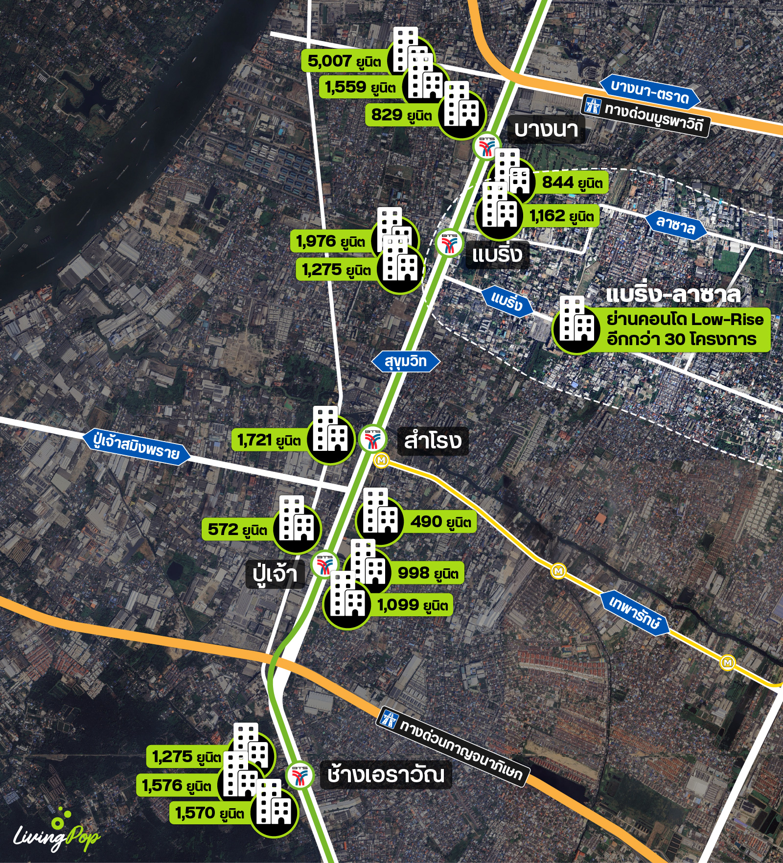 ถ้ารวมแค่ “คอนโดติดรถไฟฟ้า” 10 กว่าปีนี้ก็มีโครงการเปิดใหม่กว่า 20,000 ยูนิตแล้วครับ นี่ยังไม่นับรวมคอนโด Low-Rise ต่างๆ ที่อยู่ในซอย อย่างซอยแบริ่ง-ลาซาล ที่มีอีกกว่า 30 โครงการ ทำให้ทำเลตรงนี้กลายเป็นย่านอยู่อาศัยใหม่ สำหรับทั้งคนที่ทำงานในโซนสมุทรปราการ และใครที่มองหาคอนโดทำเลเชื่อมต่อเข้าย่านสุขุมวิทได้แต่ราคาไม่สูงมาก