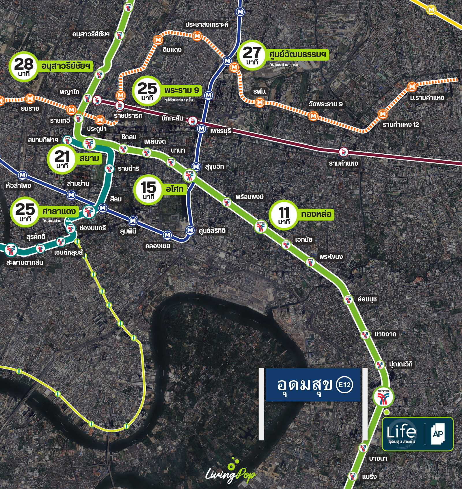 ข้อดีของการที่อยู่บนเส้นรถไฟฟ้า BTS ที่เป็นสายหลักคือไม่ต้องเปลี่ยนสาย และใช้เวลาเข้าเมืองได้ค่อนข้างรวดเร็วครับ อย่างจากอุดมสุข ถือว่าเป็นย่านนั่งรถไฟฟ้าเข้าเมืองใช้เวลาไม่นานเลยครับ ถ้าไม่นับเวลารอรถ 2-4 นาที จากที่นี่ แค่ 21 นาทีก็ไปถึงสยามแล้วครับ ดังนั้นถ้าใช้งานไปรถไฟฟ้าไปย่านแหล่งงานต่างๆ อย่างอโศก-พร้อมพงษ์-ทองหล่อนี่ก็ยิ่งใกล้เลย ใช้เวลาแค่ 11-15 นาทีเท่านั้น เพราะห่างเพียงแค่ 6-8 สถานีเองครับ หรือจะเปลี่ยนสายเป็นสายสีน้ำเงินที่แยกอโศก สายนี้ก็สามารถไปเชื่อมต่อโซนพระราม 4 – รัชดา – พระราม 9 ได้