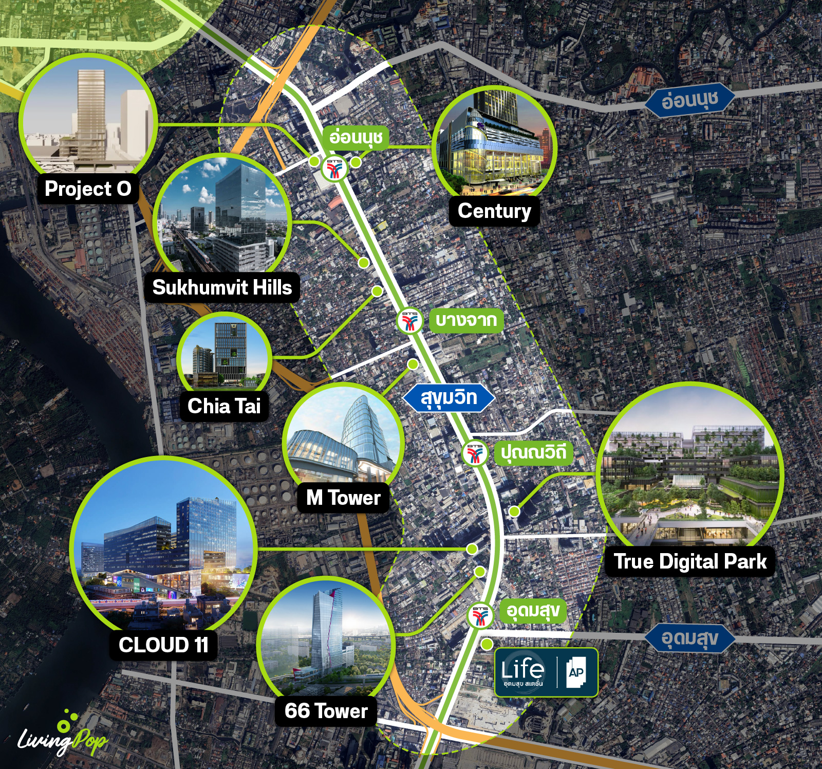 ทั้งหมดที่ว่ามา อยู่ในระยะเพียงแค่ 500 เมตร – 1 กิโลจากแยกอุดมสุขเท่านั้นเอง ทำให้ตรงนี้เป็นอีกโซนนึงที่มี Project ขนาดใหญ่ล้อมรอบเลย