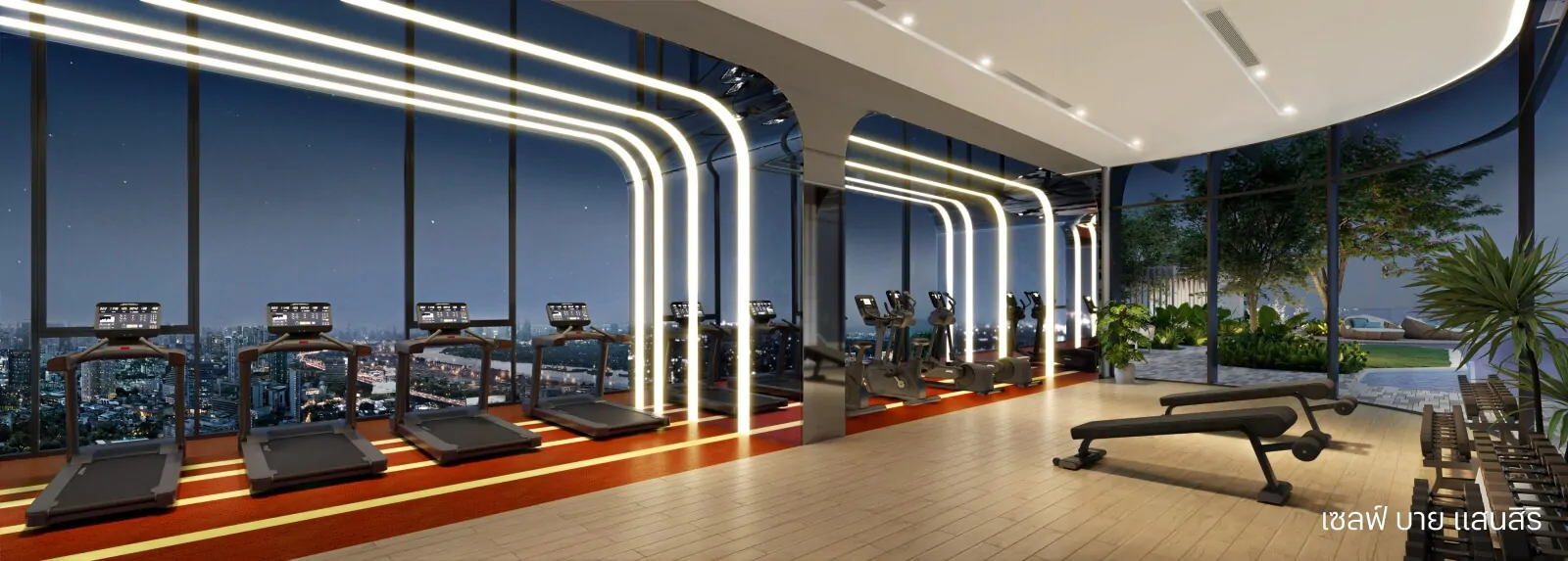 ห้องออกกำลังกายที่มีทั้ง Cardio และ Weight Training เพดานและผนังกระจกมาแบบโค้งรับกับตัวอาคาร จะเห็นวิวเมืองครับ ในห้องนี้จะมี Private Room ที่มาพร้อมกับเครื่อง Reformer สำหรับการฝึก Pilates อย่างเต็มรูปแบบ