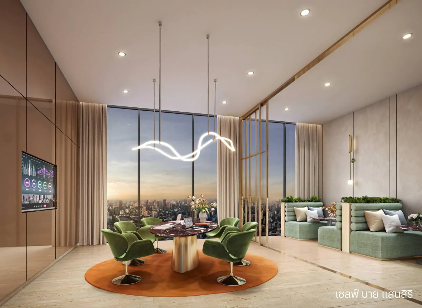 Idea Lounge เขาออกแบบมาเพื่อรองรับการทำงานทั้งเดี่ยวและกลุ่ม มีโต๊ะยาว คุยงานเป็นกลุ่มได้ ส่วนฝั่งด้านขวาจะเป็น Co-pantry ครับ เป็นห้องที่จะได้รับวิวแบบเต็มๆ ด้วยกระจกเต็มบาน มีการตกแต่งด้วย หิน Verde Lapponia จากฟินแลนด์ โดดเด่นด้วยลวดลายสีเขียว ก็จะเป็นงานดีไซน์ที่เป็นเอกลักษณ์ของโครงการนี้ Mood&Tone คล้ายๆ กับในส่วนของ Lobby