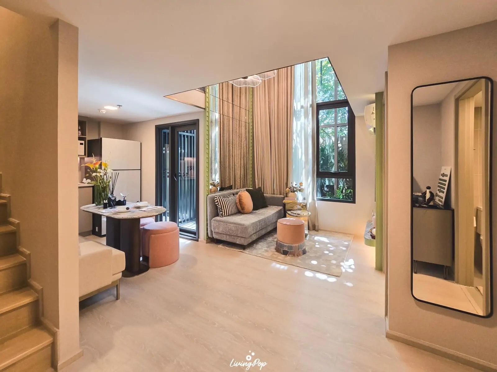 หน้าต่างบานใหญ่เกือบถึงพื้นละฮะ พื้นที่ Double Volume อาจจะไม่ได้กว้างเท่าอีกไทป์ เพราะจะเน้นให้ชั้น 2 มีพื้นที่ใช้สอยเยอะครับ ห้องจะมีพื้นที่ว่างตรงกลาง อย่างที่บอกฮะ ผมว่าโต๊ะกินข้าวยื่นออกมาได้อีก ไม่เกะกะแน่นอน มุมนั่งเล่นจริงๆ วางโซฟาได้หลายแบบเลย จะวางเหมือนห้องตัวอย่างก็ได้ หรือจะวางเป็น L-shape หรือหาอาร์มแชร์มาวางเพิ่มก็ได้เช่นกัน พื้นที่ตรงนี้ขนาดพอประมาณ วางโซฟาได้ 2 ที่นั่งครับ เป็นห้องที่สามารถหา Chandelier สวยๆ มาโชว์ได้