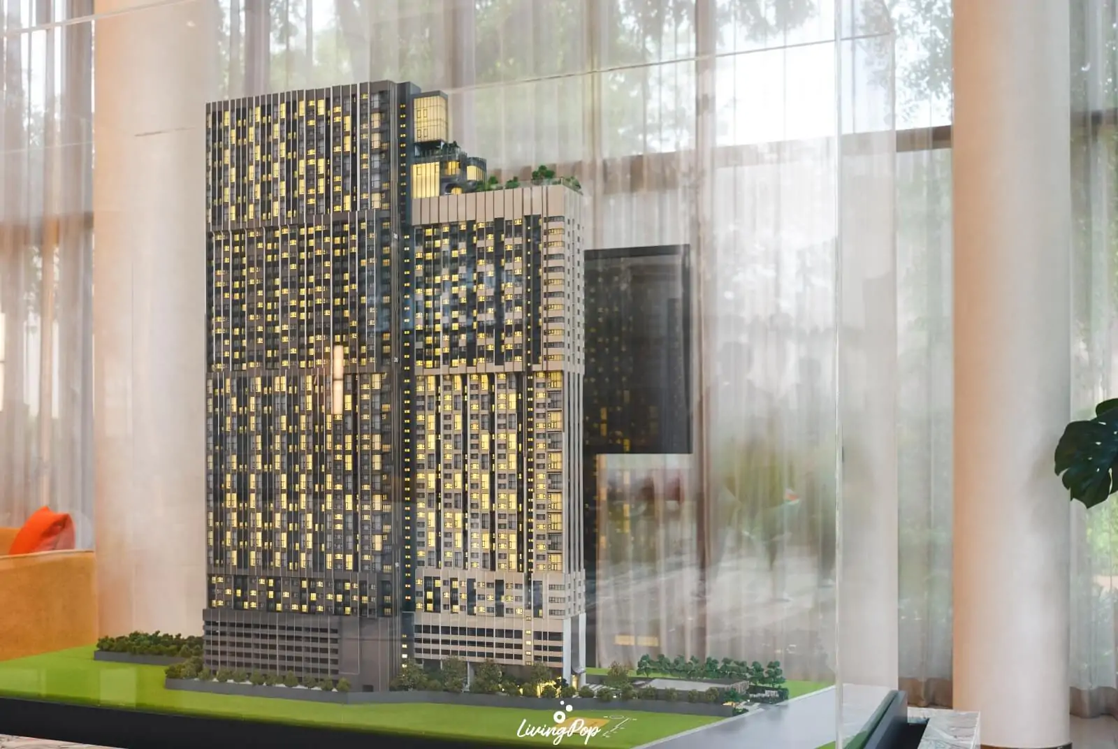 ลงมาดูที่ชั้นล่างกันบ้างครับ ด้านหน้าโครงการจะมีอาคารร้านค้าที่จะอยู่ด้านหน้าติดกับถนนเลย โมเดลทำออกมาเหมือนกับภาพ Perspective เมื่อกี้มากฮะ ตอนนี้ยังไม่สรุปว่าเป็นร้านอะไรที่จะมา แต่ถ้าเป็นร้านสะดวกซื้อก็จะสะดวกกับลูกบ้านมากครับ และมีลูกค้าเป็น 2 คอนโดติดกันเลย ด้านหลังอาคารร้านค้าก็จะมีที่นั่ง เอาไว้พักผ่อนได้ กินข้าวได้ มีสวนชมวิวในตัวด้วย