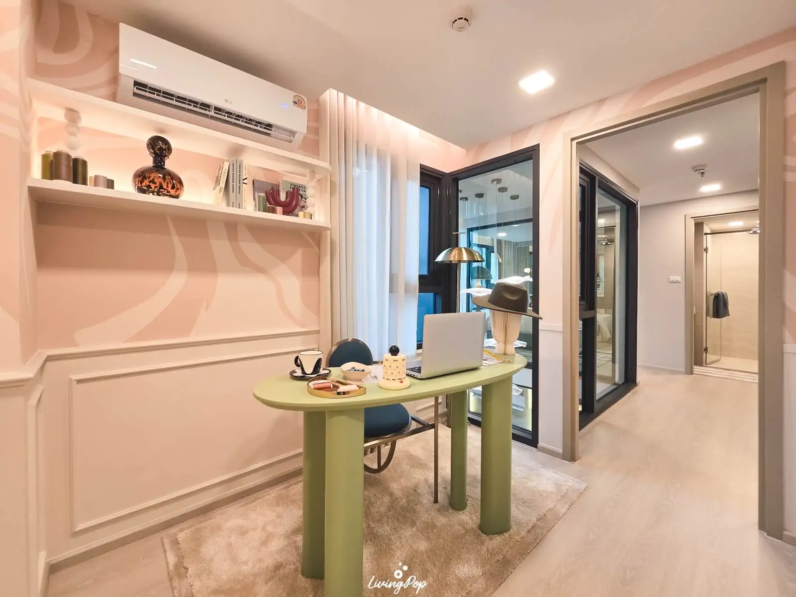 ขึ้นมาเจอพื้นที่อเนกประสงค์ครับ ห้องตัวอย่างแต่งเป็นมุมทำงาน เราสามารถทำเป็นมุมพักผ่อนอื่นๆ ได้เหมือนกันนะ และเห็นบานกระจกไหมครับ ทุกพื้นที่ในห้องชั้นบนโครงการจะทำบานกระจกเป็นช่องแสง ให้มองเห็นห้องนั่งเล่นด้านล่างได้หมดเลย บรรยากาศเลยค่อนข้างโปร่งมากครับ และได้แสงธรรมชาติจากหน้าต่างห้องนั่งเล่นเข้ามาด้วย