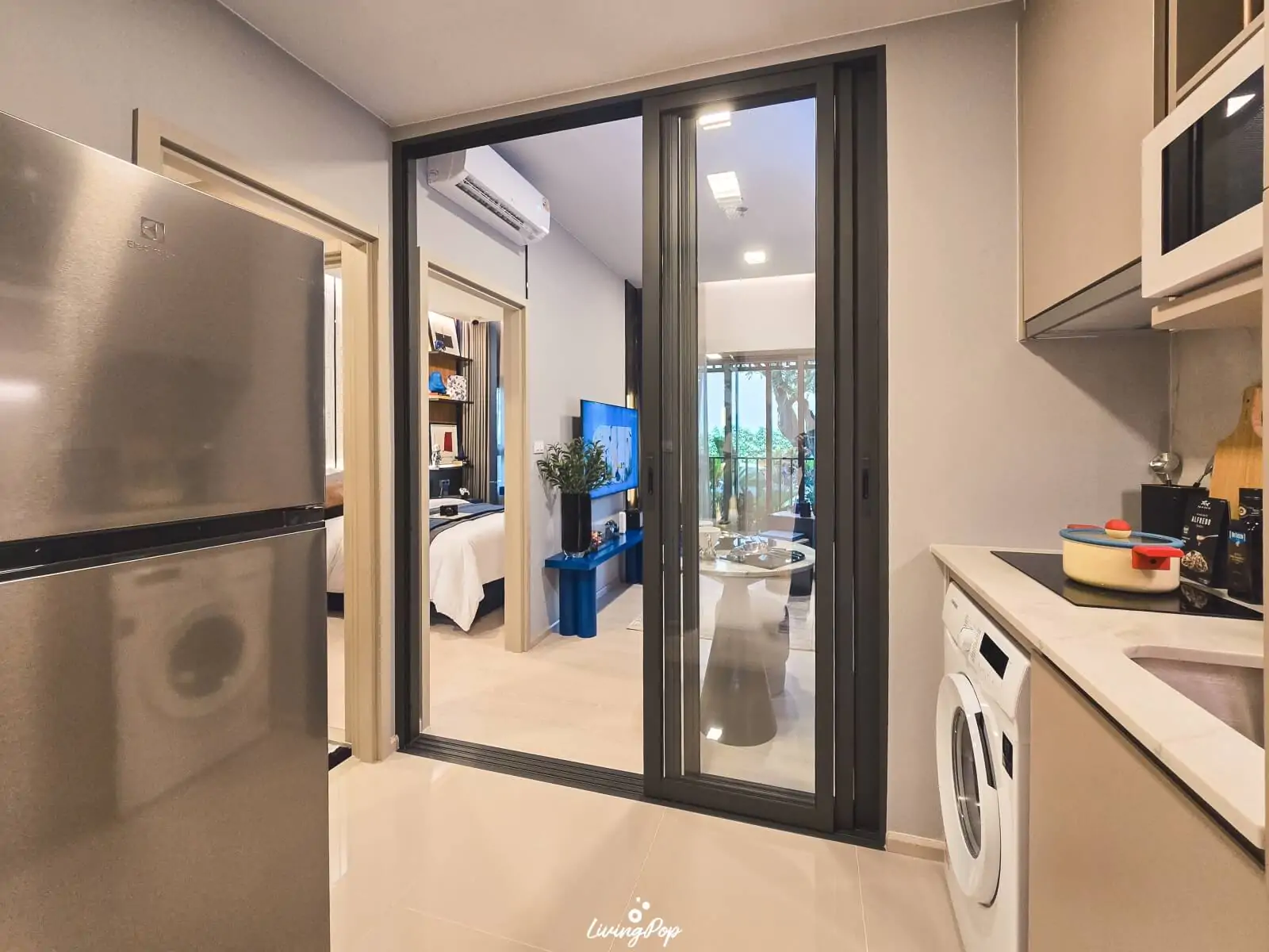 มาต่อกันที่ 1 Bedroom ขนาด 29.75 – 30.75 ตารางเมตรกันบ้าง ห้องนี้เป็น Simplex จัด Layout มาสวยเลย ปกติถ้าเปิดมาแล้วเจอครัว ก็จะได้พื้นที่เล็กๆ ไม่ได้ใหญ่มาก แต่ด้วยความที่ห้องหน้ากว้างกว่า 5.1 เมตร ทำให้พื้นที่ครัวกว้างขึ้น ชุดครัว Built-in มาให้ทั้งฝั่ง พร้อมตู้เก็บรองเท้าในตัว มีเตาไฟฟ้า เครื่องดูดควัน และอ่างล้างจานมาให้ เครื่องซักผ้าก็ไม่ต้องวางที่ระเบียง เพราะเคาน์เตอร์ครัวมีพื้นที่รองรับ ส่วนตู้เย็นสามารถวางตรงข้ามเคาน์เตอร์ครัวได้เลย พื้นที่พอดีเป๊ะ