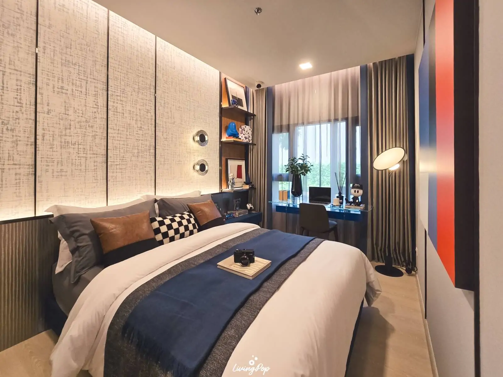 ห้องนอนจะเป็นผนังทึบ จะได้ความเป็นส่วนตัวมากขึ้น ถ้าอยู่สองคนก็มีพื้นที่ส่วนตัวให้แต่ละคนได้ ห้องนอนใหญ่พอสมควร วางเตียง 5 ฟุตได้แบบไม่อึดอัด พื้นที่ข้างเตียงเหลือเยอะอยู่ครับ ซึ่งโครงการวางโต๊ะทำงานอยู่ที่ด้านข้าง แต่ถ้าใครอยากได้เตียงใหญ่ๆ เปลี่ยนโต๊ะเป็นเตียง 6 ฟุตห้องนี้ก็ยังไหวครับ ห้องตัวอย่างเป็นไอเดียที่ดีในการทำชั้นวางของเพิ่มมากครับ นอกจากจะใช้ประโยชน์ได้แล้ว ยังแต่งห้องได้ด้วย ริมหน้าต่างวางโต๊ะทำงาน หรือมุมพักผ่อนได้อีก