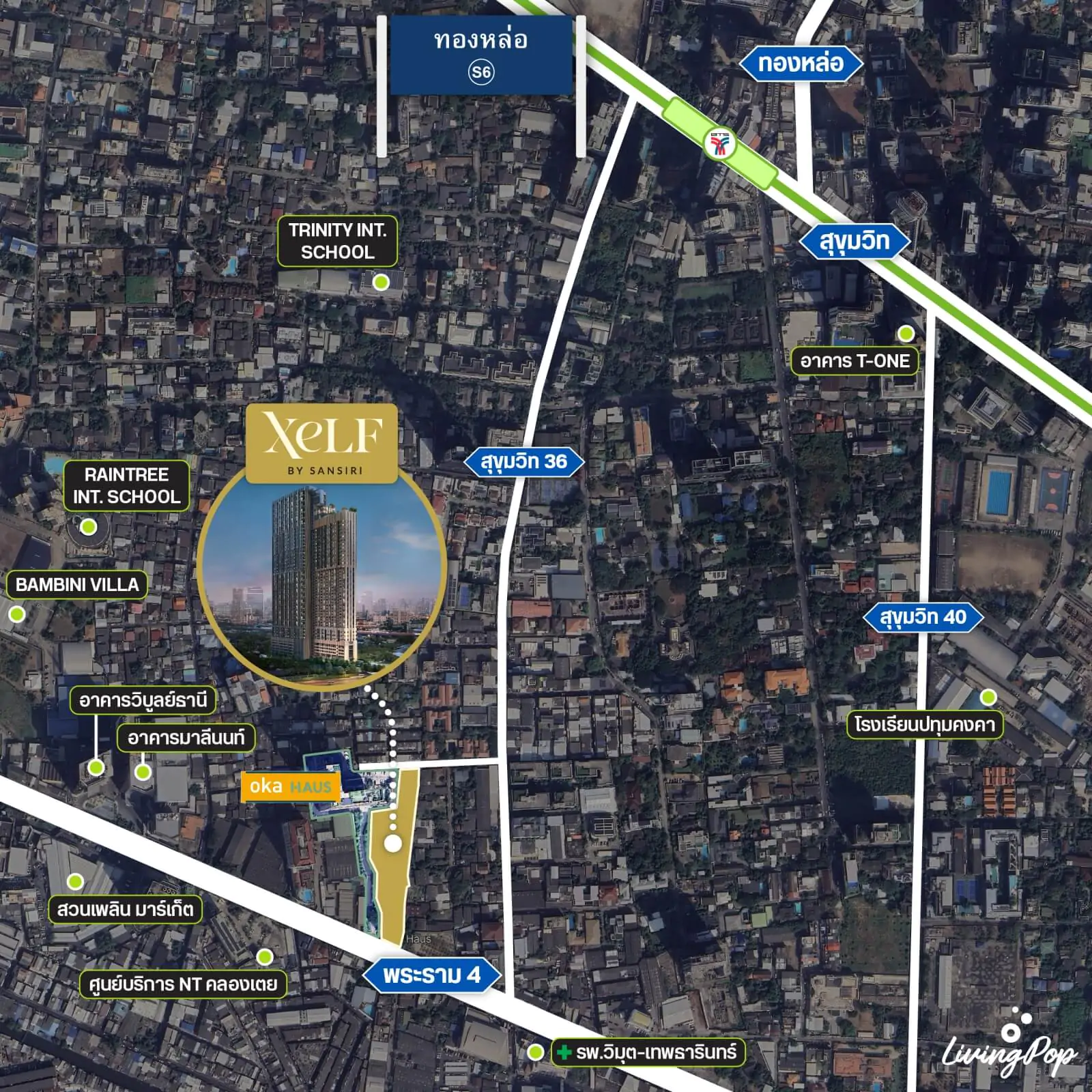 ที่นี่อยู่ติดถนนพระราม 4 เลย และใกล้ซอยสุขุมวิท 36 แค่ 190 เมตรครับ ซึ่งสามารถทะลุไป BTS ทองหล่อได้ประมาณ 1.2 กิโลฯ ดังนั้นตัวทำเลเลยจะอิงจากสองฝั่งเลย ทั้งฝั่งสุขุมวิทเองและฝั่งถนนพระราม 4