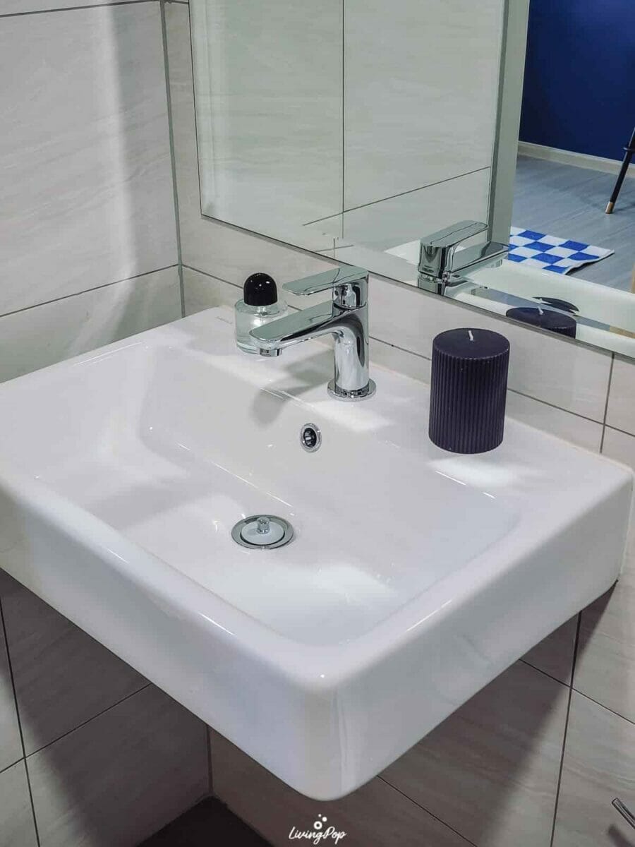 ห้องน้ำจะได้สุขภัณฑ์ครบฮะทั้งอ่างล้างหน้า กระจก ชักโครก ที่ใส่ทิชชู่ สายฉีดชำระ และฝักบัว ยี่ห้อ Hafele มีฉากกั้นกระจกกับเครื่องทำนำ้อุ่นที่เราสามารถติดตั้งเพิ่มเองได้ พื้นและผนังจะปูด้วยกระเบื้องเซรามิค