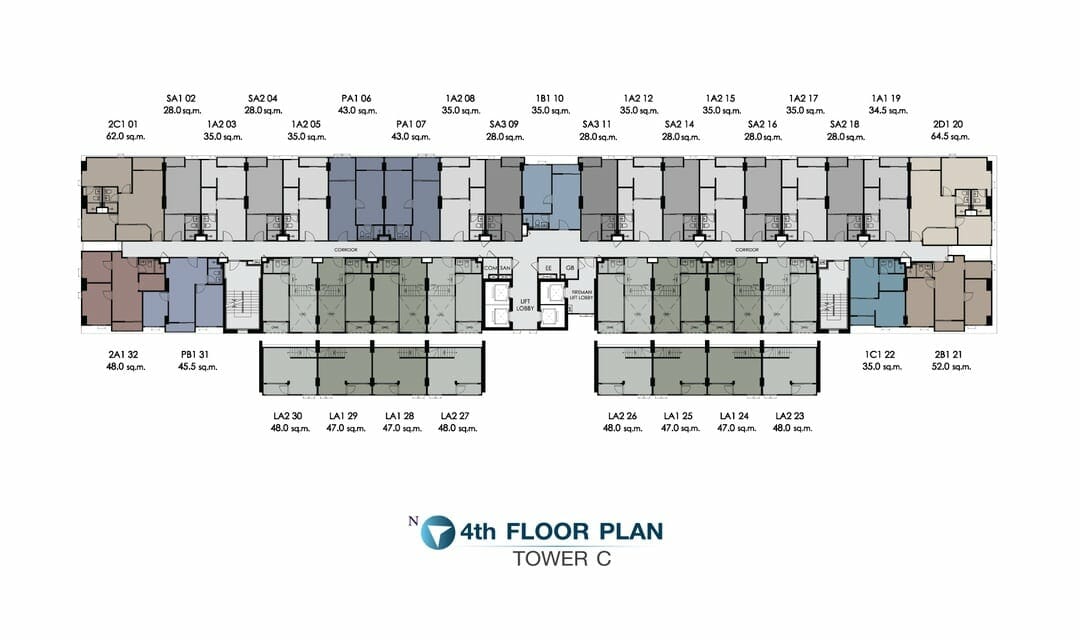 ห้องพักอาศัยจะเริ่มตั้งแต่ชั้น 4 ไปจนถึงชั้น 17 ทุกชั้นแปลนจะเหมือนกันครับ ยกเว้นชั้น 4 ที่จะมีห้อง Loft 2 ชั้น อาคารละ 8 ห้อง