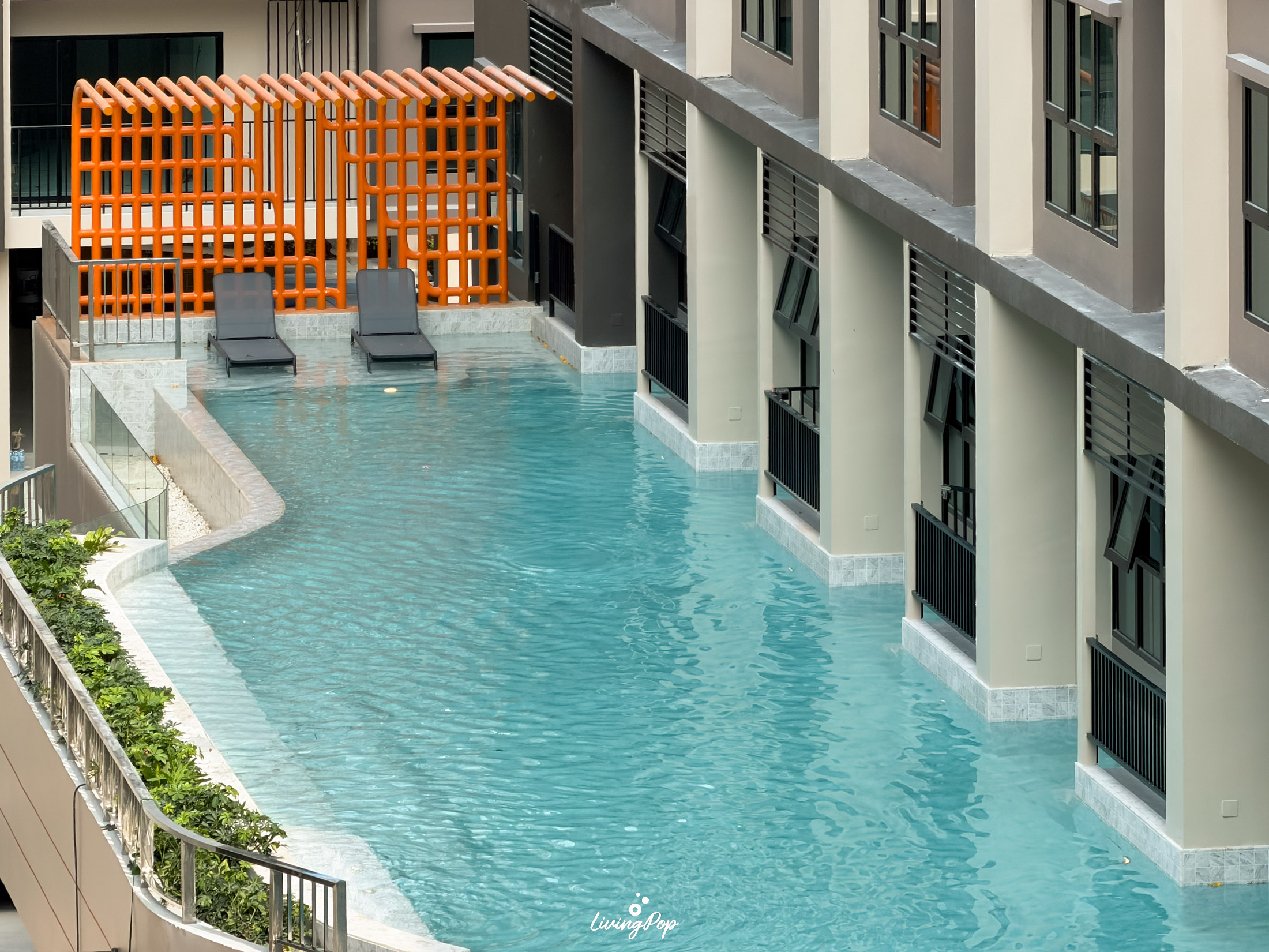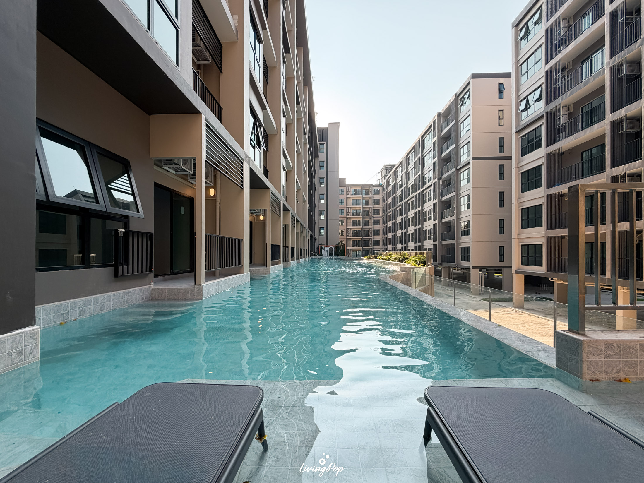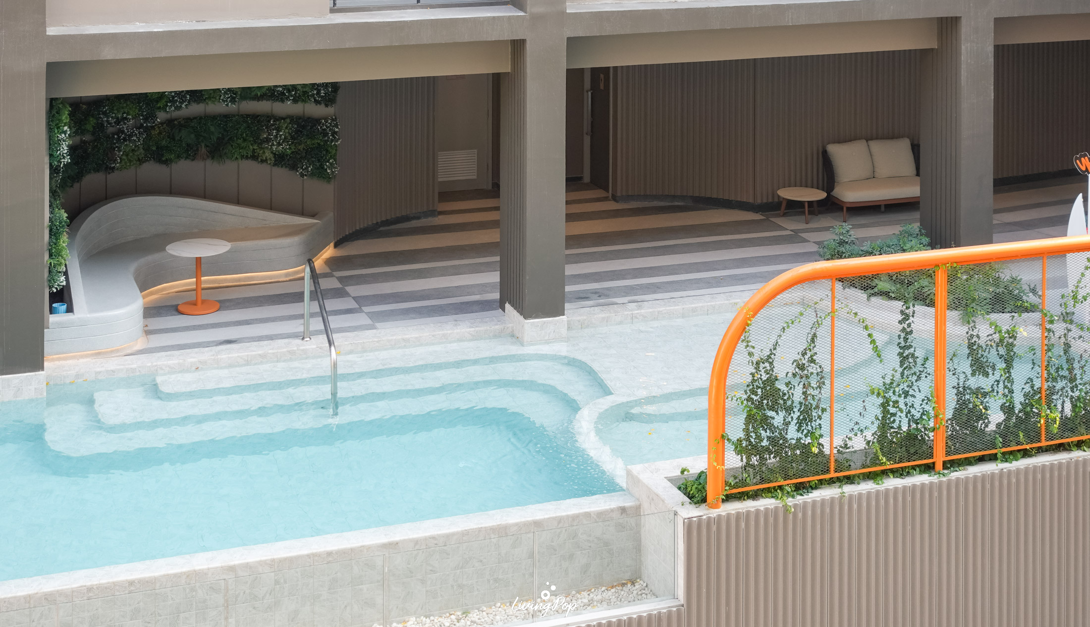 อีกมุมหนึ่งที่เป็นพื้นที่พักผ่อนของโครงการ จะเป็นบริเวณ Sunken เล่นระดับ ที่อยู่ติดกับสระว่ายน้ำครับ มุมนี้นอกจากเป็นที่นั่งแล้ว ยังเป็นมุมที่ถ่ายรูปเก๋ๆ ได้ เห็นวิวสระแนวยาวที่อยู่ในด้านหลัง