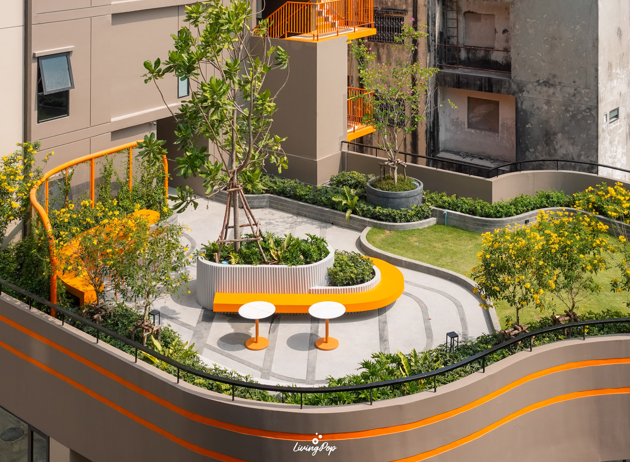 สำหรับ Pocket Garden ในชั้น 3 พอขึ้นมาแล้วรู้สึกได้เลยว่าเงียบสงบครับ ไม่วุ่นวาย มีแค่เสียงลม เขาจะปูหญ้าเอาไว้ แล้วล้อมรอบด้วยพุ่มไม้ มีต้นไม้แทรกตามจุดต่างๆ ส่วนฝั่งพักผ่อนจะอยู่ใกล้กับทางเข้า มีต้นไม้ใหญ่ตรงกลาง ซ้อนด้วยที่นั่งสีส้ม มีโต๊ะเล็กๆ มาให้เผื่อเราเอาไว้วางของ หรือตอนเย็นๆ มานั่งทำงานรับแสงรับลมได้ อีกด้านจะเป็นบาร์โค้งที่มีฉากเป็นระแนงสีส้ม แทรกด้วยไม้เลื้อย ดูแตกต่างแต่เข้ากันได้ดี มุมนี้ก็จะเป็นที่นั่งสูงได้ฟีลเคาน์เตอร์บาร์ฮะ