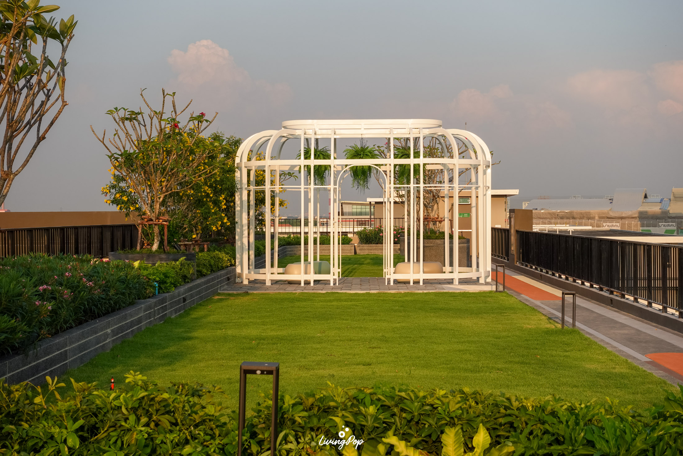 ฝั่งซ้ายจะเป็นพื้นที่สวนแบบยาวๆ มีสนามหญ้าแบบขั้นบันได มานั่งเล่นได้ เขาปลูกต้นไม้ตามแนวระเบียงเอาไว้เพิ่มความร่มรื่นด้วย ตรงกลางจะเป็น Pavilion เขาทำเป็นศาลาโครงเหล็กสีขาว ด้านบนแต่งด้วยต้นไม้แขวน ด้านล่างมีที่นั่ง รับลมรับแดดเต็มครับโซนนี้ มองวิวได้รอบทิศเลย แต่อาจจะต้องรอให้ต้นไม้โตกว่านี้หน่อย น่าจะช่วยเพิ่มร่มเงามากขึ้นได้