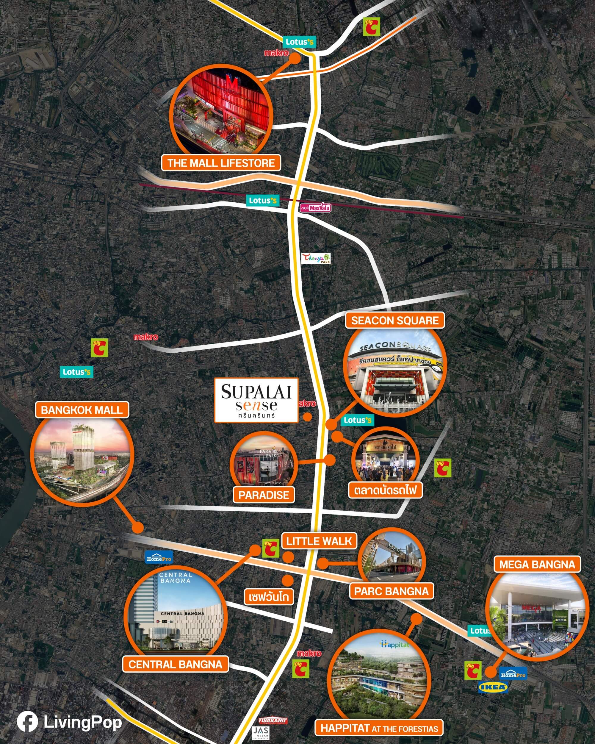 ก่อนจะไปถึงตัวโครงการ เราขอมาพูดถึงทำเลของ “Supalai Sense ศรีนครินทร์” กันก่อนครับ ที่นี่อย่างที่เล่าไปว่าตัวโครงการจะเน้นกลุ่มคนทำงานในทำเลรอบนอก ศรีนครินทร์ก็เป็นอีกย่านนึงที่ถือว่าเป็นแถบกรุงเทพรอบนอก แต่ก็มีแหล่งงาน แหล่งชุมชน ห้าง ร้านค้า รวมไปถึงธุรกิจต่างๆ ตั้งอยู่เยอะพอสมควร