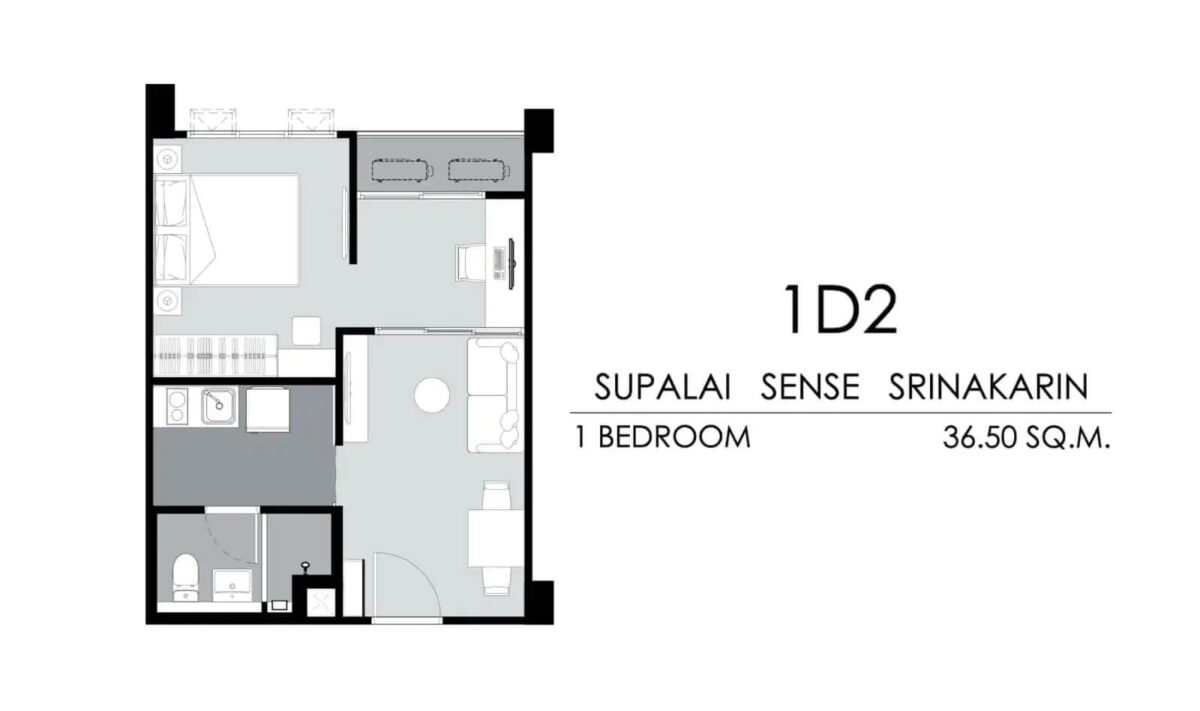 ห้องนี้จะมีไทป์เดียว Layout เดียวให้เลือกครับ แบ่งห้องเป็นสัดส่วนเหมือนเดิม เพิ่มเติมคือมีห้องอเนกประสงค์ เป็นประตูบานเลื่อนกระจกกั้น เพราะห้องอเนกประสงค์อยู่ติดกับระเบียง แสงจากข้างนอกจะได้ส่องเข้ามาถึงตัว Living Area ได้ ครัวจะอยู่ปีกซ้ายของห้อง สามารถวางชั้นหรือ Built-in ตู้เก็บของเพิ่มเติมเองได้ ห้องน้ำก็จะเข้าจากทางห้องครัว ส่วนห้องนอนขนาดกำลังดี วางเตียง ชั้นวางทีวี ตู้เสื้อผ้า และโต๊ะทำงานได้