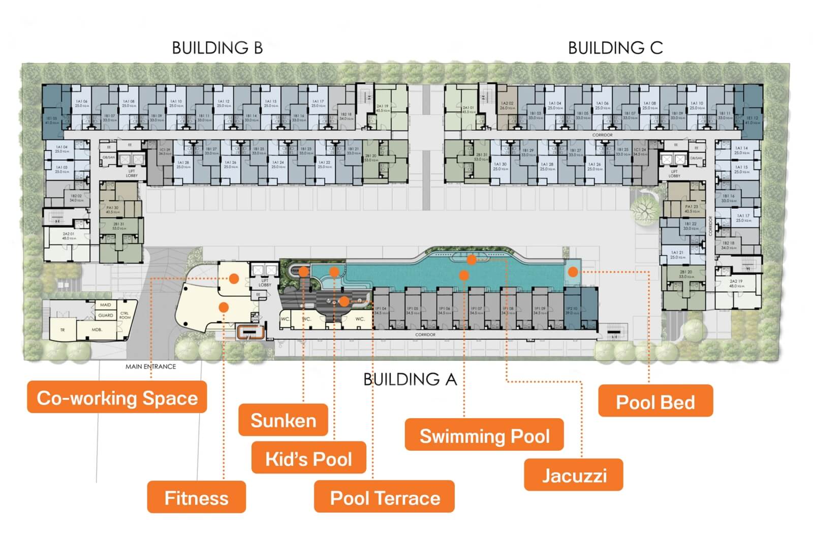 | Facility : | Lobby, Drop Store, Vending Machine Space, Food Drop, Pocket Garden Swimming Pool&Jacuzzi, Fitness, Co-working Space, Roof Garden, Pavilion |