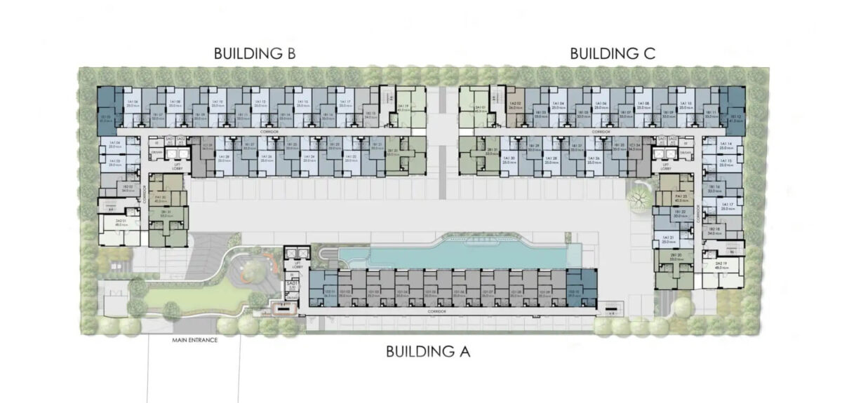 | รูปแบบโครงการ : | Low Rise 3 อาคาร อาคาร A สูง 7 ชั้น อาคาร B และ C สูง 8 ชั้น |