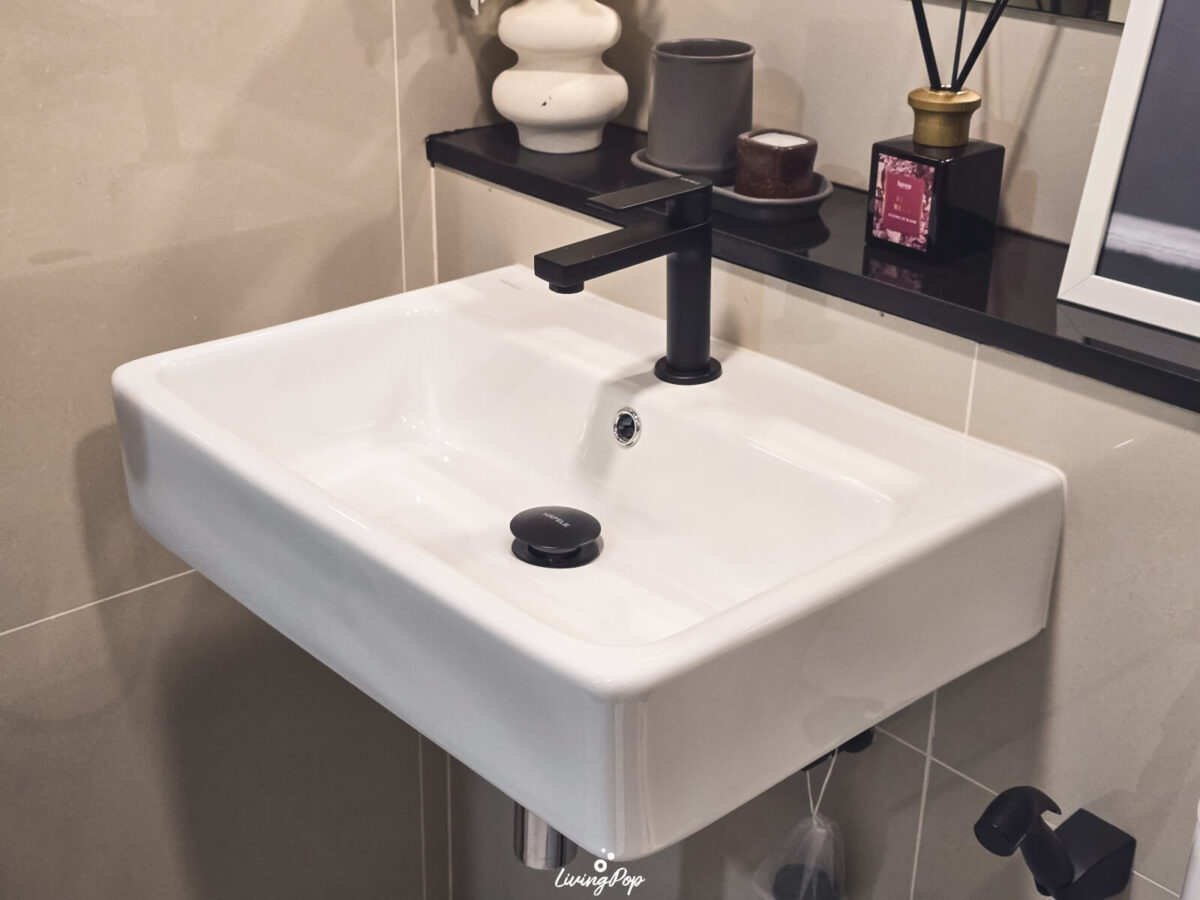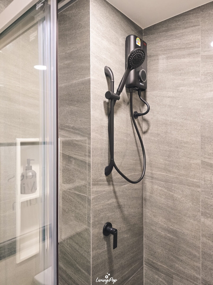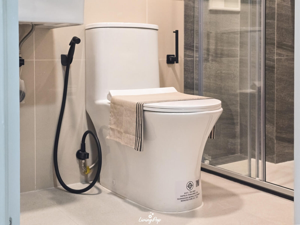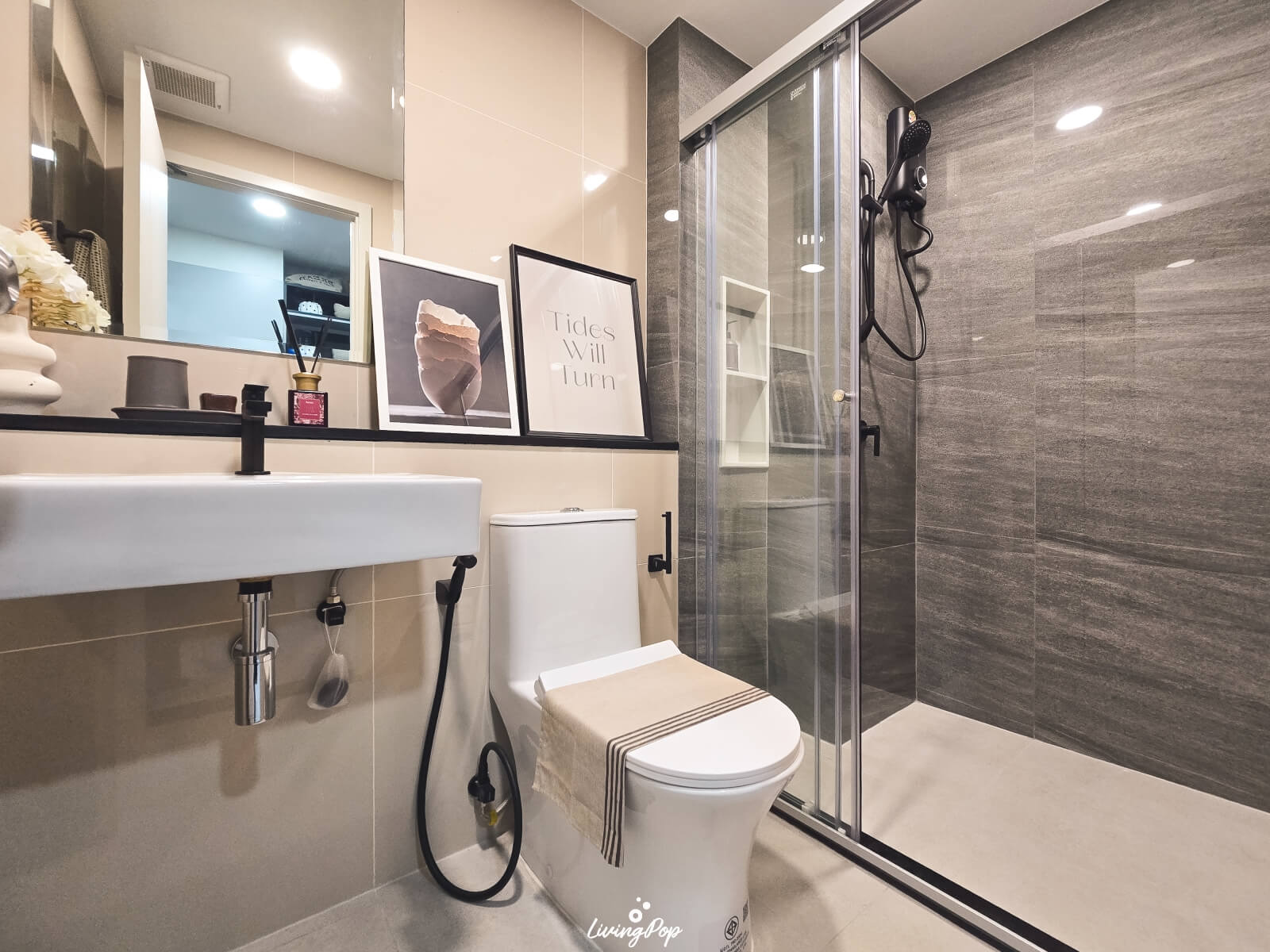 ห้องน้ำจะได้เหมือนกับห้องตัวอย่างเลยครับ สุขภัณฑ์ทั้งหมดของ Hafele อ่างล้างหน้าด้านล่างจะไม่ได้มีตู้เก็บของนะครับ แต่ถ้าอยากได้ที่เก็บของ เราก็วางชั้นหรือตู้มาเพิ่มเองได้ ชักโครกก็ติดตั้งมาพร้อมสายชำระและที่วางกระดาษทิชชู่ ด้านหลังชักโครกกับอ่างล้างหน้าวางของได้ทั้งฝั่ง มีกระจกมาให้ด้วย ข้างๆ กระจกยังว่างนะครับ ถ้าใครไม่อยากวางชั้นที่พื้นก็วางชั้นบนนี้แทนได้ เพิ่มพื้นที่เก็บของแบบแนวตั้ง ห้องอาบน้ำก็จะมีฉากกั้นกระจกแบบบานเลื่อน ด้านในมีชั้นวางของแบบเจาะผนัง ในส่วนของเครื่องทำน้ำอุ่นก็จะติดตั้งมาให้เลย เป็นสีที่เข้ากับฝักบัวและก๊อกน้ำ
