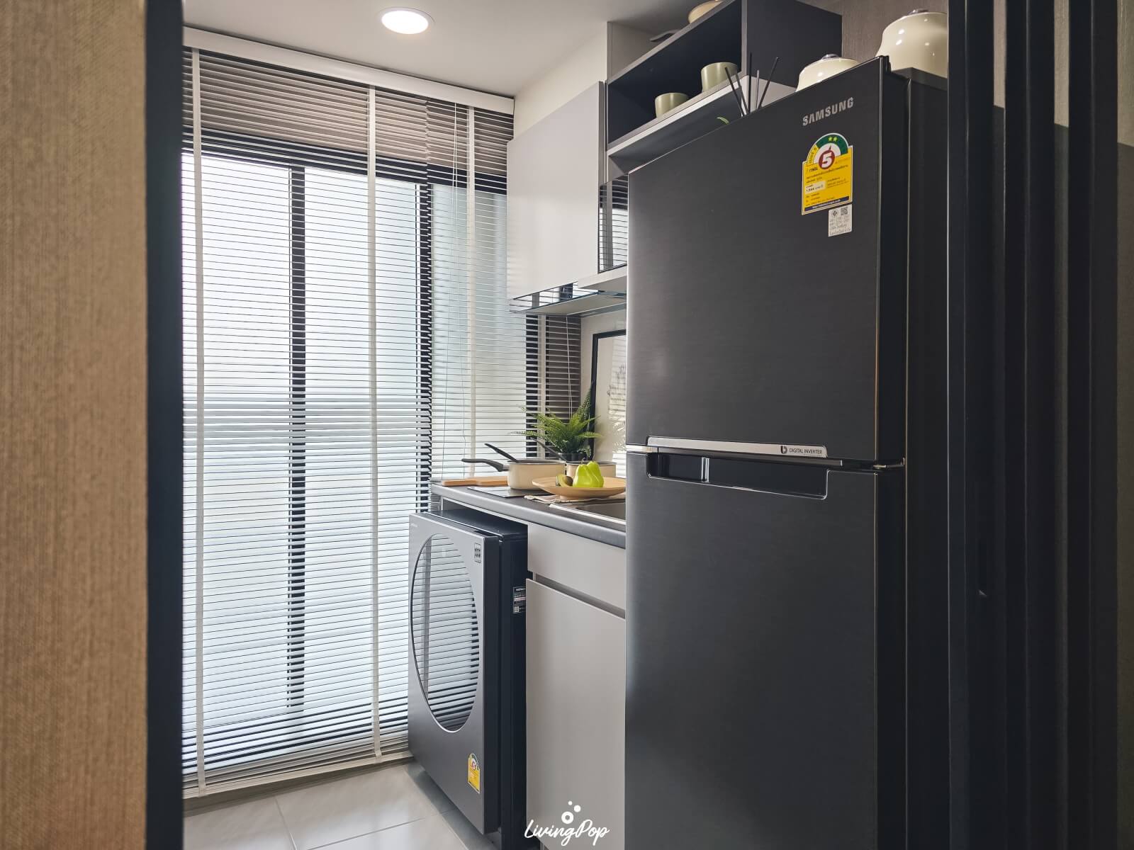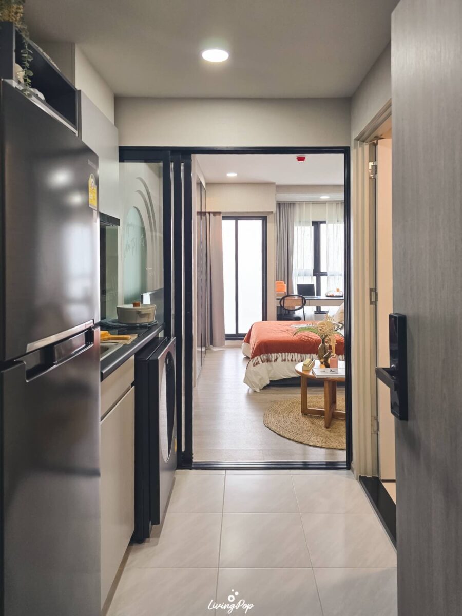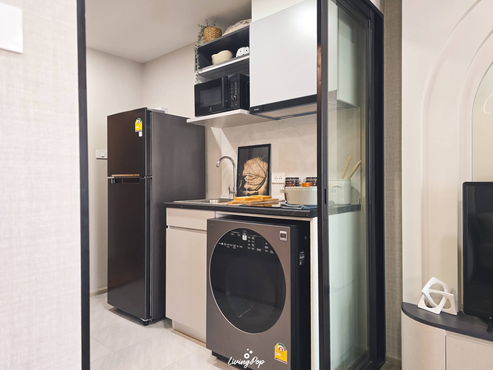 ไทป์นี้เรียกได้ว่าเป็นขนาดเริ่มต้นของโครงการเลยครับ เป็น 1 Bedroom ขนาด 25 ตารางเมตร ที่ได้ครัวปิดอยู่ด้านหน้าห้องเลย ชุดครัวที่ได้นอกจากตู้เก็บของต่างๆ ก็จะมีที่วางไมโครเวฟ และช่องวางเครื่องซักผ้าด้วย ทั้งยังติดตั้งอ่างล้างจาน เตาไฟฟ้าและเครื่องดูดควันยี่ห้อ Hafele มาให้แล้ว โซนครัวก็เรียกได้ว่าครบเลยครับ มุมที่วางตู้เย็นก็กว้าง ด้านข้างมีช่องเหลือ สามารถเอารถเข็นเล็กๆ มาไว้อุปกรณ์เครื่องปรุงหรือของใช้ต่างๆ ได้ ตรงข้ามกับโซนครัวก็จะเป็นห้องน้ำ