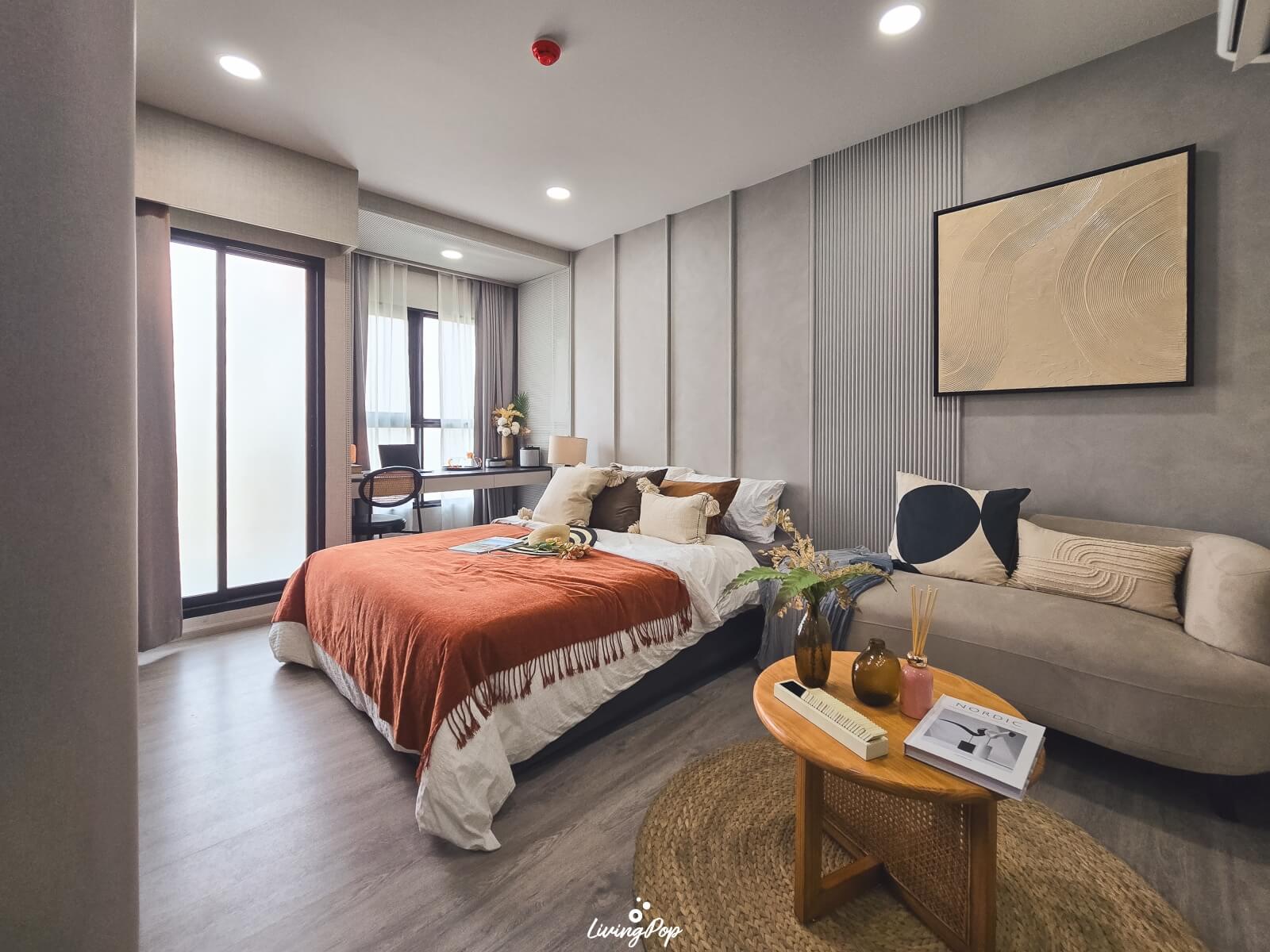 เดินเข้ามาหน่อยจะเจอกับ Living Area ขนาดใหญ่เลย ฝั่งซ้ายสามารถวางชั้นวางทีวีและตู้เสื้อผ้าได้ ส่วนฝั่งขวาก็วางโซฟาขนาด 2 ที่นั่ง เตียงนอน และริมหน้าต่างก็ทำเป็นมุมอเนกประสงค์ที่ปรับเปลี่ยนได้ตามความต้องการ ด้วยความที่เขาให้หน้าต่างบานใหญ่บวกกับมีระเบียงอยู่ติดกับ ทำให้ช่องแสงเยอะ ส่องสว่างทั้งห้องแบบที่ไม่ต้องเปิดไฟในตอนกลางวันยังได้
