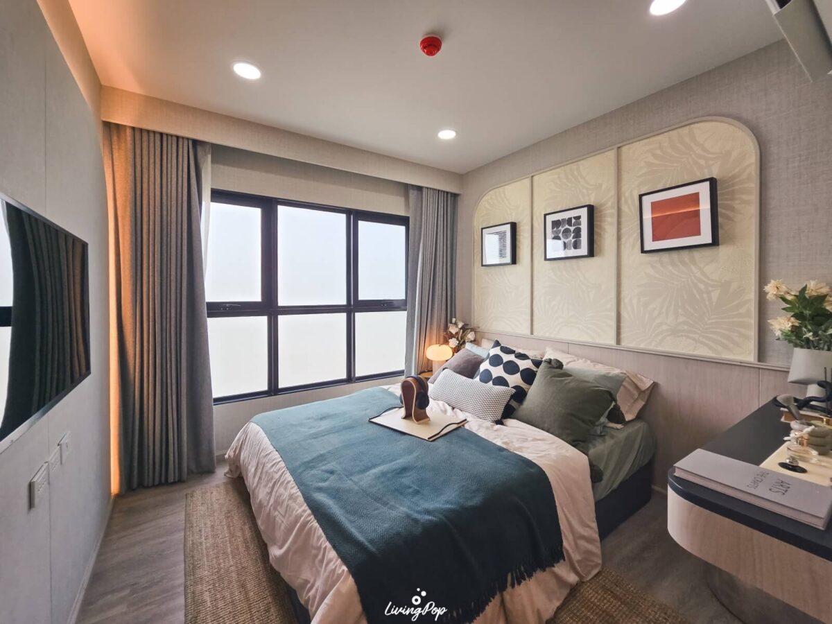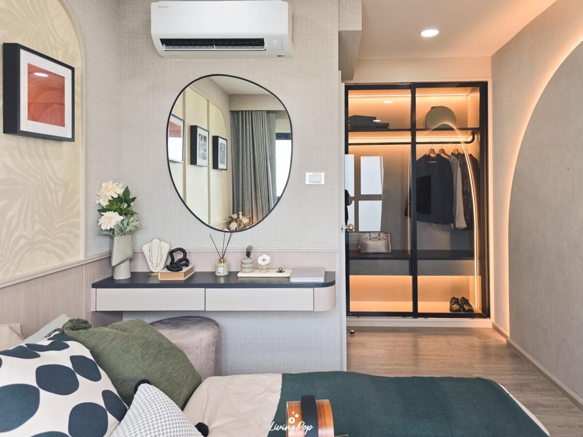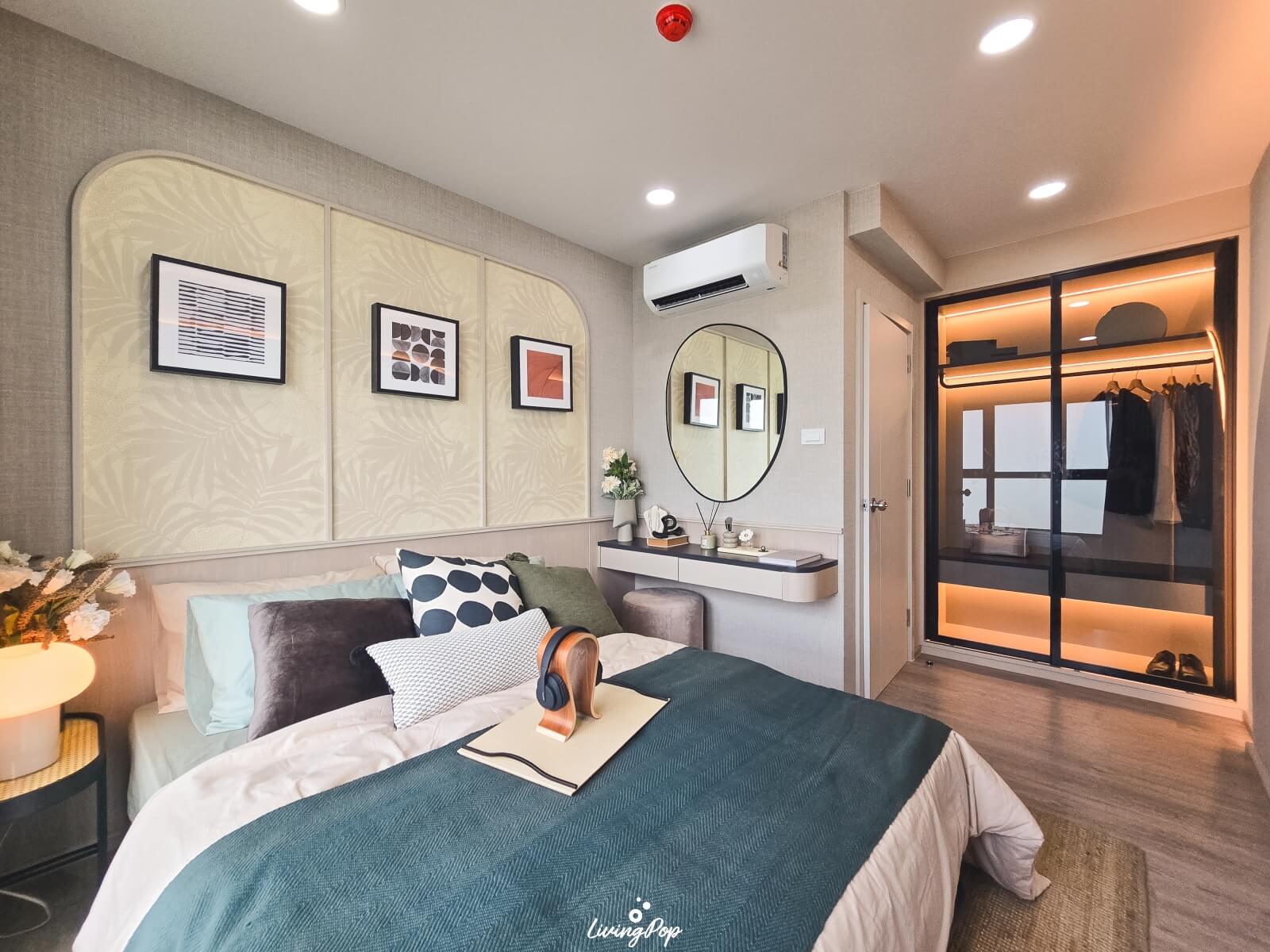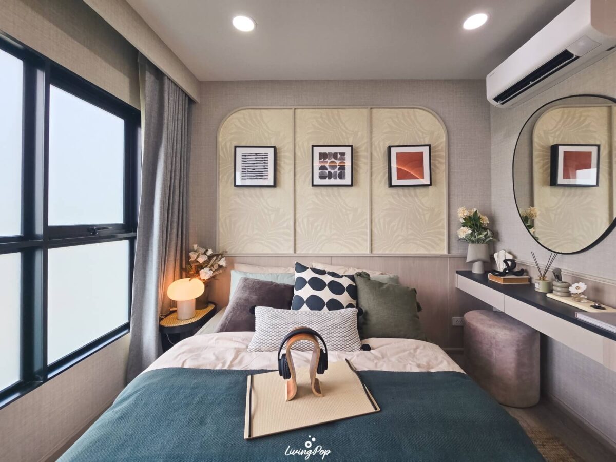 ห้องตัวอย่างทำห้องนอนออกมาได้ค่อนข้างลงตัวเลยครับ เตียงนอนก็จะอยู่ใกล้กับหน้าต่าง แต่รอบๆ เตียงยังมีพื้นที่เหลือให้เดินได้ หน้าต่างกระจกใหญ่เกือบเต็มผนัง แสงเข้าเต็มๆ นอนชมวิวจากเตียงได้เลย ข้างเตียงก็วางโต๊ะข้างเตียงและโต๊ะเครื่องแป้งได้ แบบไม่เล็กด้วยครับ ใครชอบแต่งหน้าแต่งตัววางเครื่องสำอางหรือสกินแคร์ได้เยอะเลยแหละ