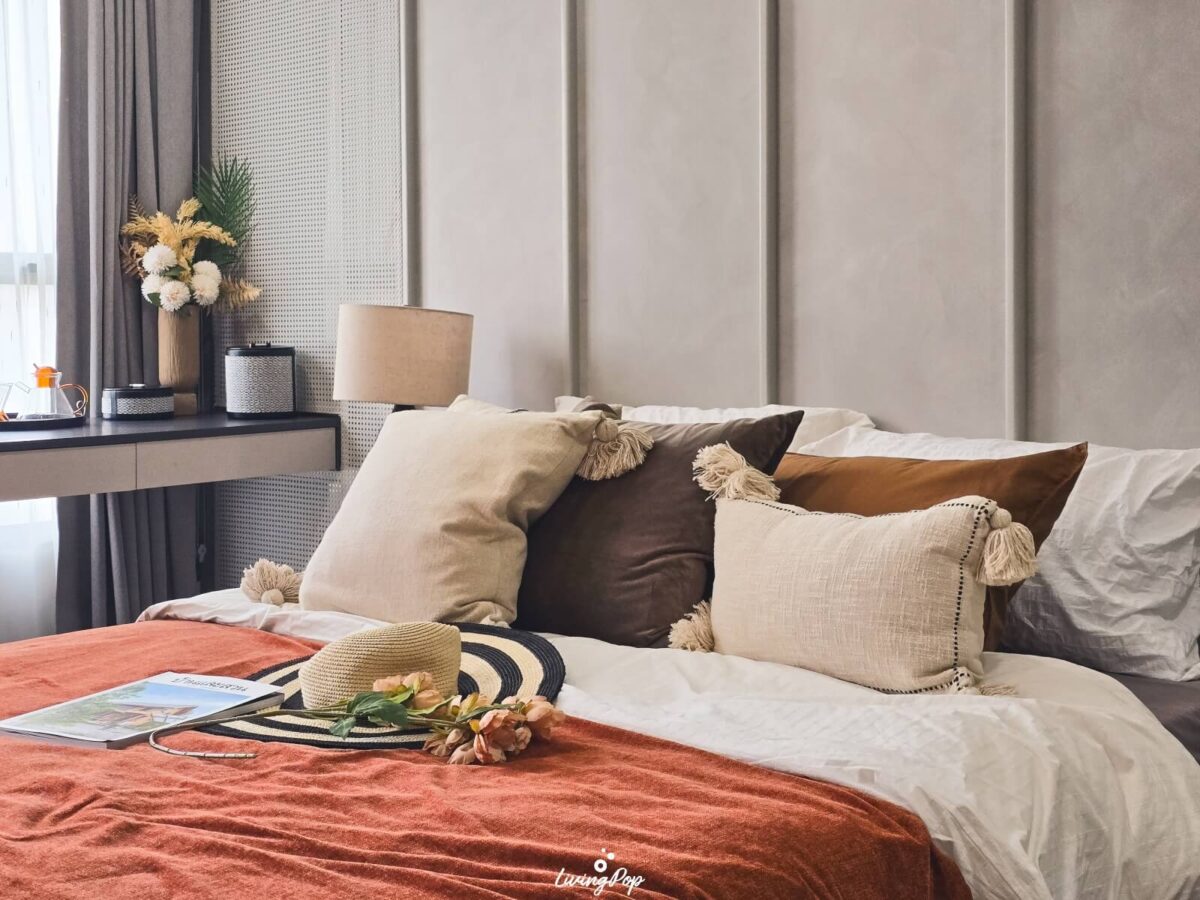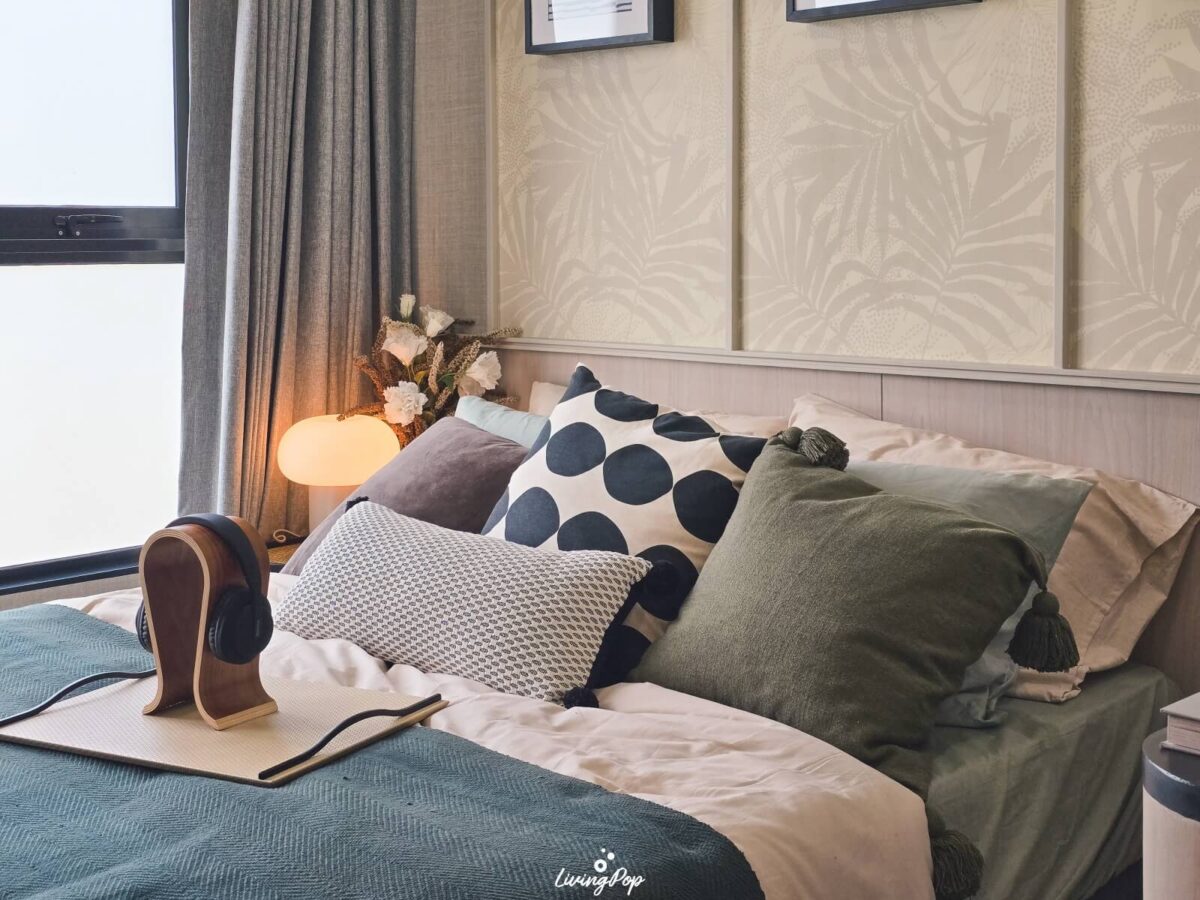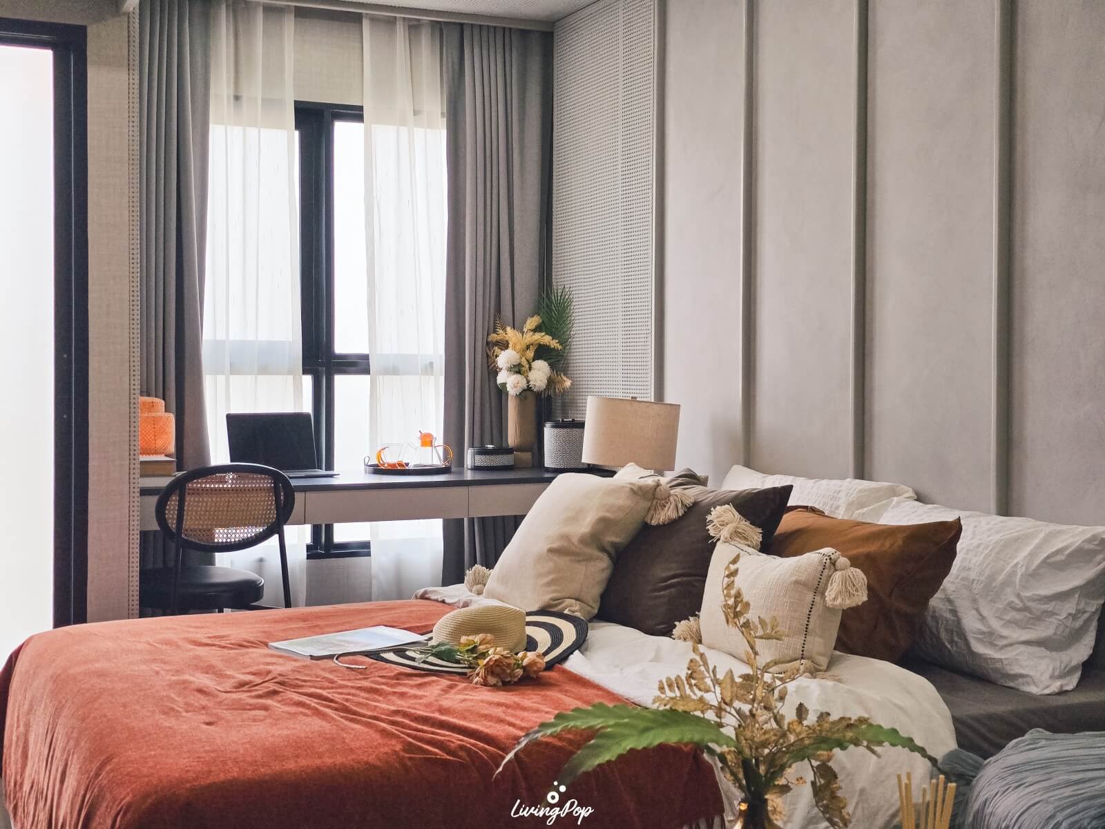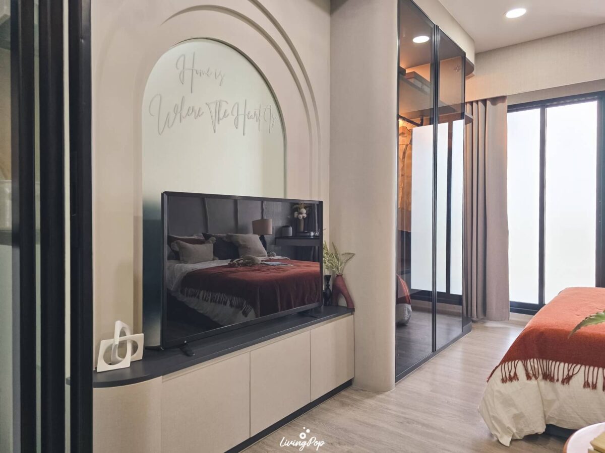 ห้องตัวอย่างทำห้องนอนออกมาได้ค่อนข้างลงตัวเลยครับ เตียงนอนก็จะอยู่ใกล้กับหน้าต่าง แต่รอบๆ เตียงยังมีพื้นที่เหลือให้เดินได้ หน้าต่างกระจกใหญ่เกือบเต็มผนัง แสงเข้าเต็มๆ นอนชมวิวจากเตียงได้เลย ข้างเตียงก็วางโต๊ะข้างเตียงและโต๊ะเครื่องแป้งได้ แบบไม่เล็กด้วยครับ ใครชอบแต่งหน้าแต่งตัววางเครื่องสำอางหรือสกินแคร์ได้เยอะเลยแหละ