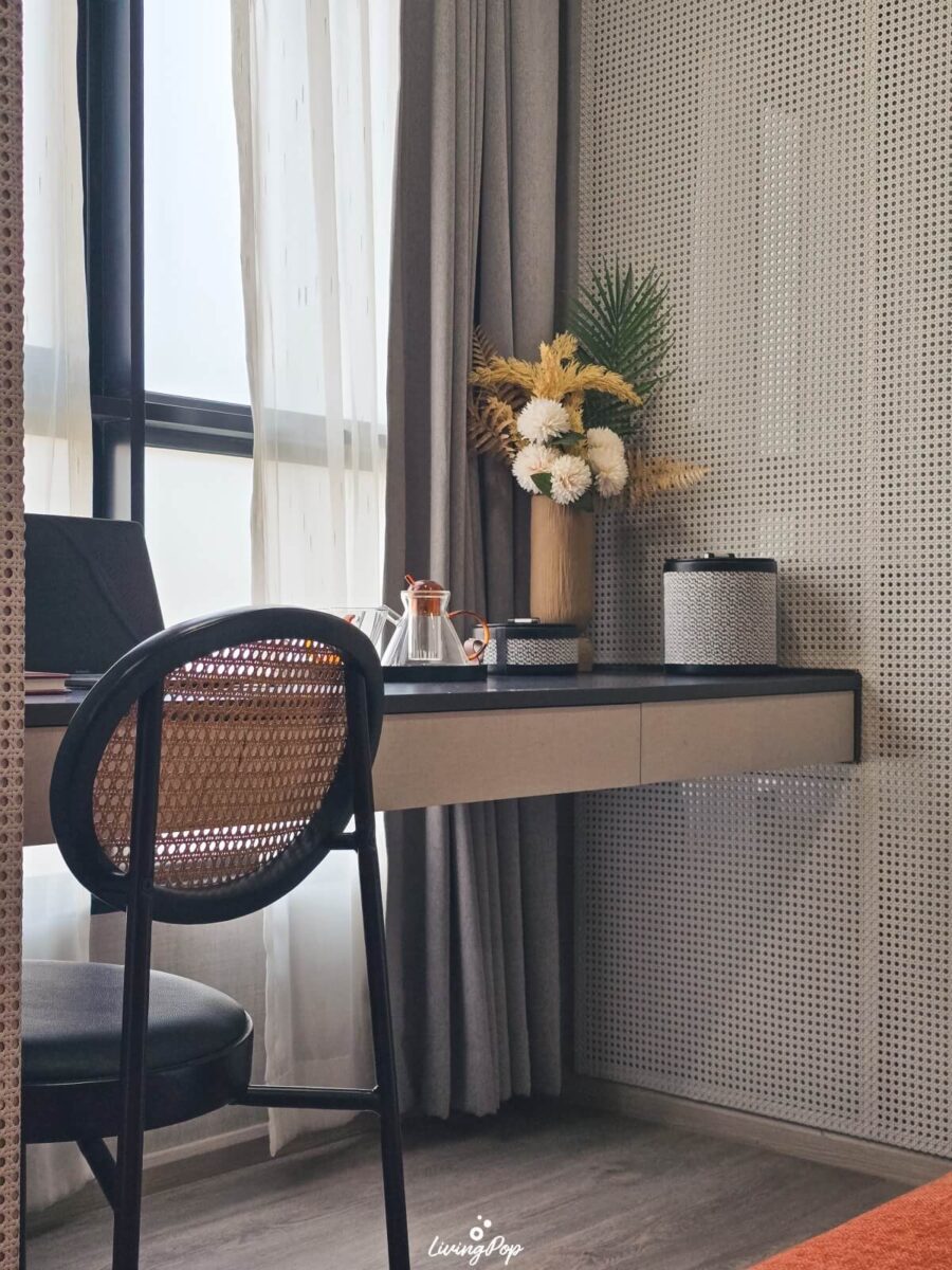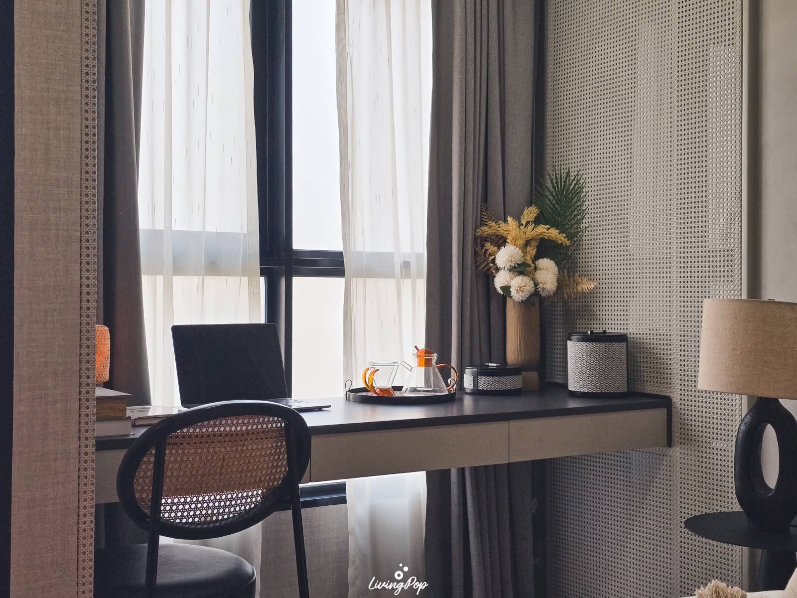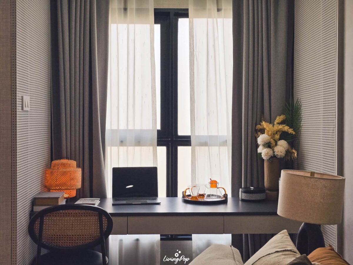 มุมริมหน้าต่างตรงนี้จริงๆ เราสามารถปรับเปลี่ยนเป็นมุมอื่นๆ ได้ตามต้องการครับ แต่ทางห้องตัวอย่างเขาแต่งเป็นมุมทำงานเป็นไอเดียให้เราเผื่อเอาไปแต่งห้องเองได้ เรียกได้ว่าเป็นมุมทำงานที่วางโต๊ะยาวๆ ได้ทั้งฝั่ง หรือใครจะชอบโต๊ะสั้นกว่านี้ แล้วเพิ่มเป็นชั้นวางของข้างๆ ก็ได้เหมือนกันฮะ โซนนี้จะอยู่ติดหน้าต่างบานใหญ่เลย รับแสงเต็มๆ สามารถมองวิวด้านนอกเวลาทำงานได้ด้วย เป็นจุดพักสายตาที่ดี สาย Work From Home น่าจะชอบมุมนี้