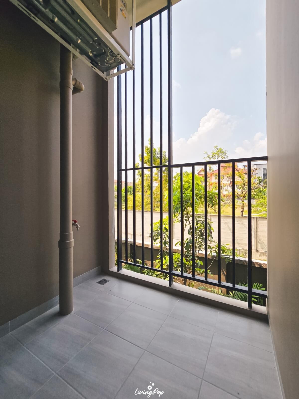 ด้วยความที่เราไม่ต้องเอาเครื่องซักผ้ามาไว้ที่ระเบียงแล้ว บวกกับคอมเพรสเซอร์แอร์ก็อยู่ด้านบน ทำให้เรามีพื้นที่ใช้สอยแบบโล่งๆ เลย สามารถตากผ้าได้ ปลูกต้นไม้ได้ ทำเป็นมุมพักผ่อนก็ได้ ล้างระเบียงก็ง่าย มีก๊อกน้ำกับท่อมาให้พร้อม ตัวระเบียงเขาทำราวด้านข้างให้สูงแบบพื้นจรดฝ้า ช่วยพรางสายตาให้ด้านนอกไม่เห็นห้องเราแบบโจ่งแจ้งจนเกินไป ยังได้ความเป็นส่วนตัวอยู่