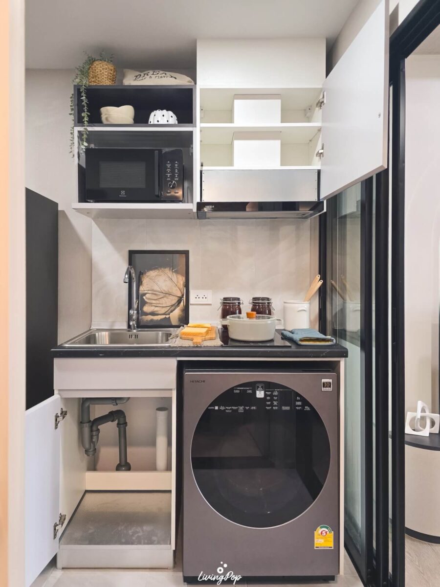 ชุดเคาน์เตอร์ครัวจะได้เหมือนกับห้องตัวอย่างเลยครับ เป็นชุดครัวมาตรฐานของทางศุภาลัยที่เราจะเห็นได้ในหลายๆ โครงการ ด้านล่างอ่างล้างจานจะเป็นตู้เก็บของโล่งๆ เราสามารถใส่ของใหญ่ๆ ได้ หรือวางชั้นเก็บของเพิ่ม จะทำให้เราจัดระเบียบเครื่องครัวและทำให้วางของได้มากขึ้นด้วย ข้างๆ เป็นช่องที่วางเครื่องซักผ้าได้ ส่วนชั้นด้านบน นอกจากจะวางไมโครเวฟได้แล้ว ก็ยังวางอุปกรณ์ครัวอื่นๆ ได้อีกฮะ