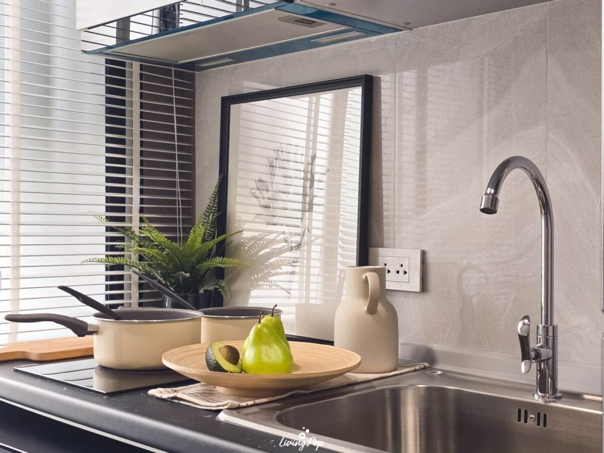 สำหรับอ่างล้างจาน เตาไฟฟ้าและเครื่องดูดควันก็ติดตั้งมาให้แล้ว จากพื้นที่เคาน์เตอร์ถ้าเพื่อนๆ เป็นคนที่ชอบทำอาหารและทำอาหารเป็นประจำ พื้นที่เตรียมอาหารอาจจะไม่พอ เราสามารถซื้อโต๊ะพับเล็กๆ มาวางเวลาทำอาหารได้นะครับ เอาไว้วางวัตถุดิบหรือเครื่องปรุง จะทำให้เรามี space มากขึ้น ด้านข้างตู้เย็นก็มีช่องว่างเหลือจะวางรถเข็นขนาดเล็ก หรือโต๊ะพับได้ เวลาที่เราไม่ได้ทำอาหาร ก็เก็บไว้ด้านข้าง ไม่เกะกะแน่นอน