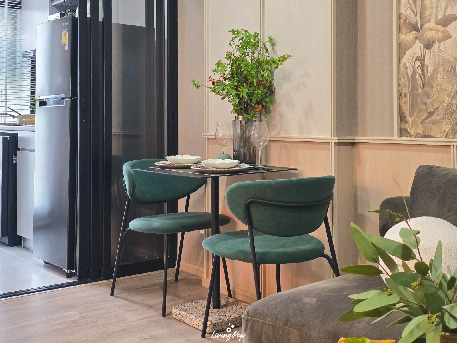 มุมกินข้าวก็จะอยู่ระหว่างมุมนั่งเล่นกับครัวครับ เราสามารถวางโต๊ะได้หลากหลายแบบเลยนะครับ จะเป็นโต๊ะกลม สี่เหลี่ยมจัตุรัส สี่เหลี่ยมผืนผ้า แล้วแต่ชอบ หรือถ้าปกติชอบกินข้าวหน้าโซฟา ชอบกินข้าวไปดูทีวีไป จะเปลี่ยนเป็นมุมทำงานก็ได้เหมือนกัน