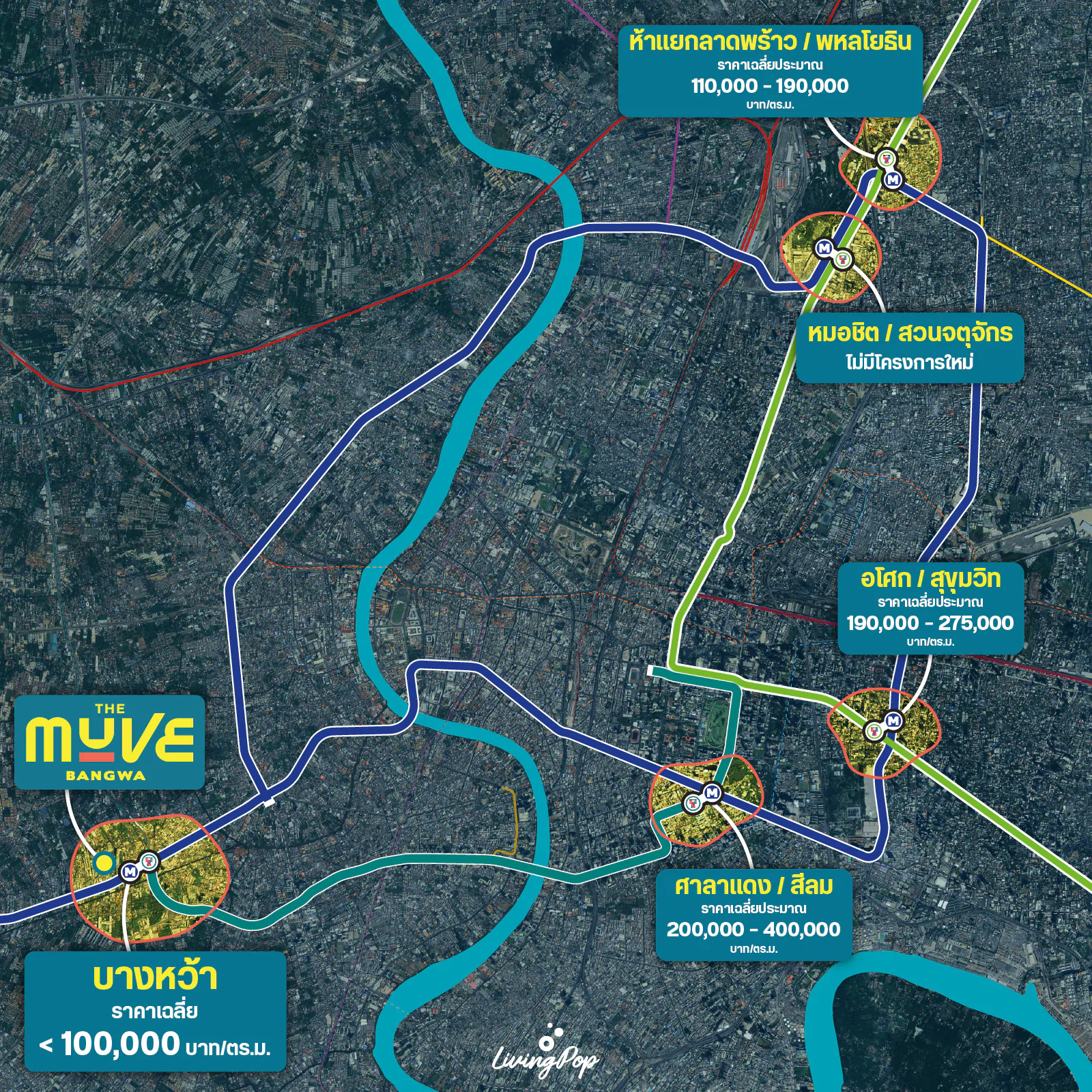และถ้าลองมาดูภาพกว้าง “ถ้าจะหาคอนโดที่ทำเลเป็น Interchange ระหว่าง BTS สายสีเขียว และ MRT สายสีน้ำเงิน” ตัวเลือกในปัจจุบันก็จะมี “อโศก-สุขุมวิท” “ศาลาแดง-สีลม” “หมอชิต-สวนจตุจักร” “ห้าแยกลาดพร้าว” และ “บางหว้า” ซึ่งถ้าลองดูราคาของแต่ละ Interchange ที่ว่าไป ราคาก็ค่อนข้างไปไกลกันพอสมควรแล้วครับ