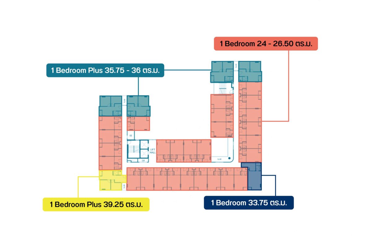 ที่นี่เป็นอาคาร Low Rise สูง 8 ชั้นที่มี 1 อาคารด้วยกัน แปลนอาคารก็จะเป็นตัว U ครับ ถ้าดูในแปลนจะเห็นว่าโถงลิฟต์อยู่ฝั่งซ้าย คนที่จะอยู่ฝั่งขวาก็อาจจะเดินไกลนิดนึง แต่ก็จะได้ความ Private มากขึ้น ไทป์ห้องส่วนใหญ่จะเน้นไปที่ 1 Bedroom 24 – 26.50 ตร.ม. เป็นหลัก (สังเกตได้จากห้องสีส้มในแปลนครับ) ส่วนห้องที่อยู่มุมอาคารจะเป็นห้องใหญ่ทั้งหมด อย่าง 1 Bedroom 33.75 ตารางเมตรจะมีแค่ชั้นละห้อง ส่วน 1 Bedroom Plus 35.75 – 36 ตร.ม. ก็จะมีชั้นละ 4 ห้อง และห้องที่ใหญ่ที่สุดในโครงการเป็น 1 Bedroom Plus 39.25 ตร.ม. จะมีชั้นละห้องครับ