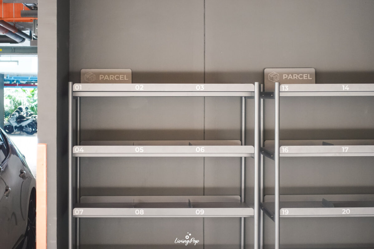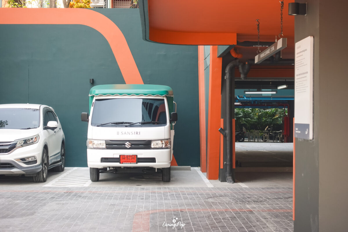 จุดที่รับพัสดุ/อาหาร จะอยู่ด้านหน้าติดกับห้องนิติบุคคล ใกล้กับ Lobby เลย ขนส่งหรือไรเดอร์ไม่ต้องขับเข้าไปไกล แล้วเราเองก็ไม่ต้องเดินออกมาเอาไกลเช่นกัน