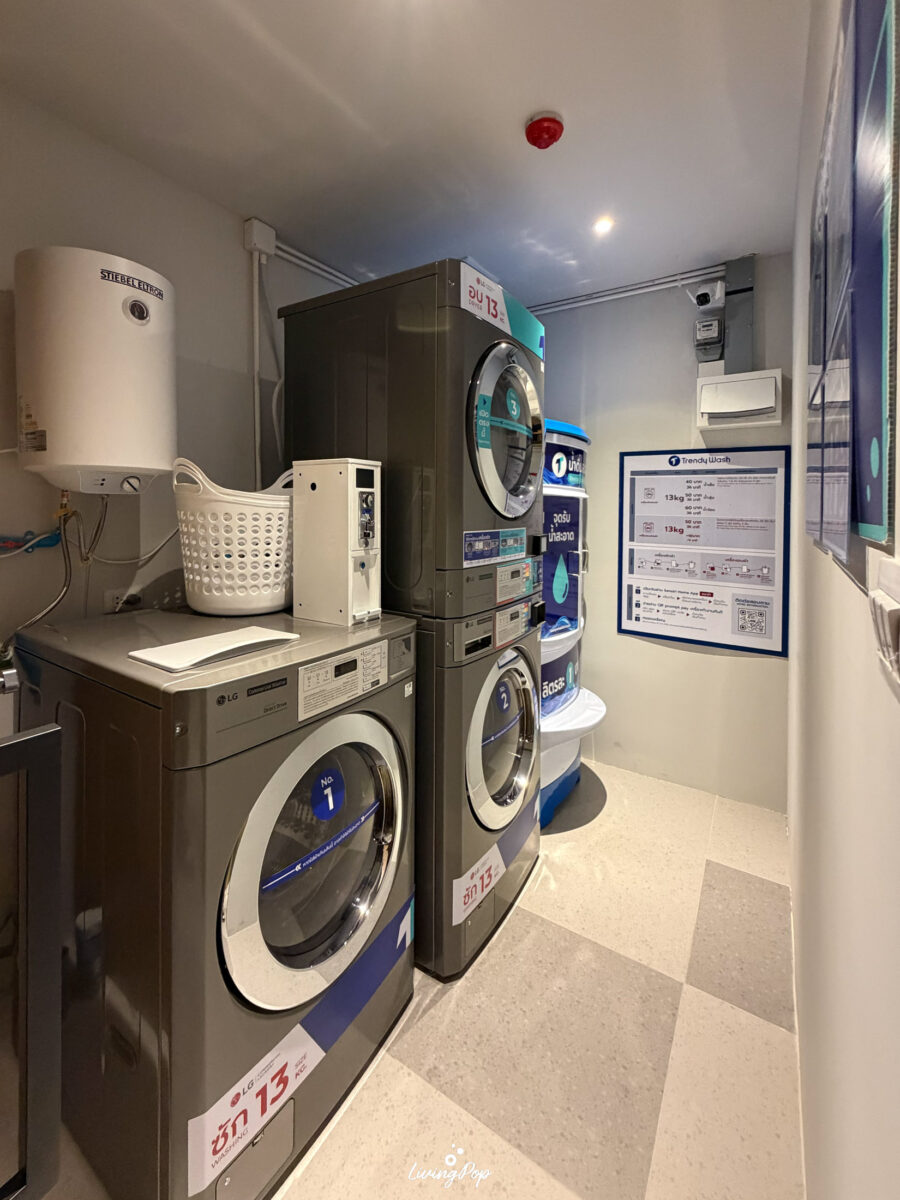 ห้องซักผ้าจะอยู่ติดกับตู้จดหมายเลย มีทั้งเครื่องซักผ้าและเครื่องอบผ้าผ่านบริการของ Trendy Wash ครับ