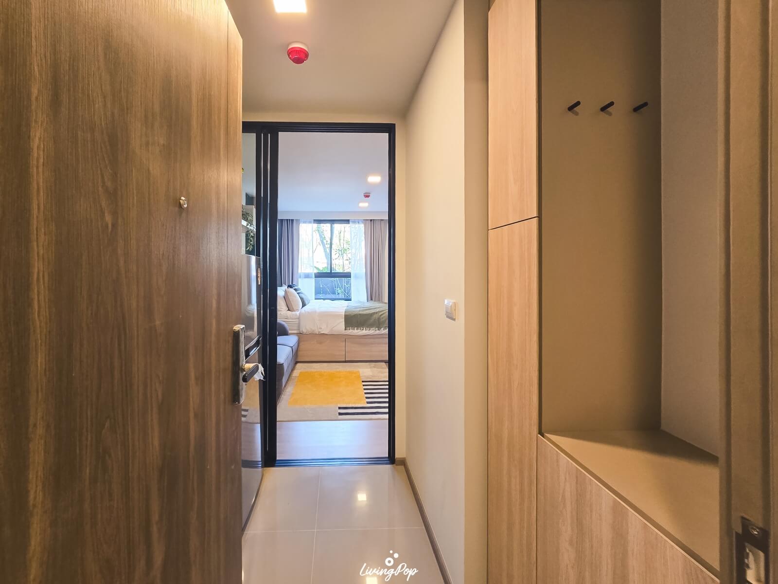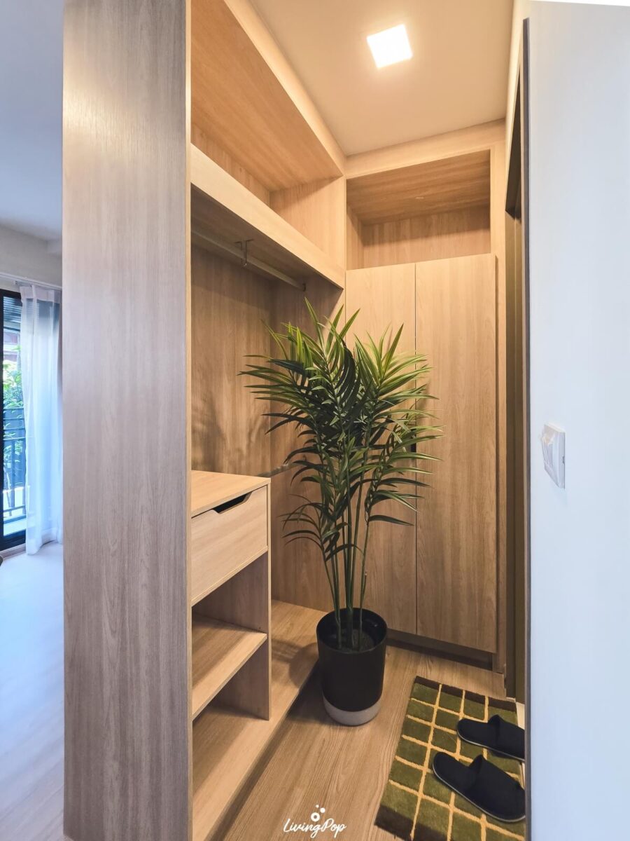 สำหรับโถงทางเข้า เปิดมาก็จะเป็นครัวครับ แต่ฝั่งตรงข้ามครัว ทางโครงการเขา Built-in ตู้เก็บของมาให้เราแล้ว ซึ่งเป็นช่องพอดีกับตัวห้องเลย ตู้นี้เป็นทั้งที่เก็บรองเท้า และของใช้ต่างๆ ได้ อย่างถ้าเรามีไม้กวาด ที่ตักผง เครื่องดูดฝุ่นหรือเตารีดต่างๆ เพื่อไม่ให้รกห้อง เราสามารถเอามาใส่ในตู้นี้ให้ดูเป็นระเบียบได้ ด้านบนตู้รองเท้า เราก็สามารถใส่ของที่เราใช้ประจำก่อนจะออกห้องได้ อย่างพวกกุญแจรถ คีย์การ์ด บัตรพนักงาน กระเป๋าเงิน หรือเครื่องประดับต่างๆ ด้านข้างตู้เขามีที่แขวนมาให้ด้วย เผื่อเราห้อยพวกพวงกุญแจ ผ้า หมวก หรือกระเป๋าต่างๆ ได้