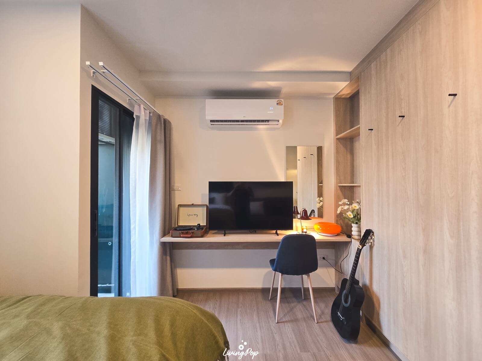 อีกฝั่งก็จะ Built-in โต๊ะมาให้เหมือนกัน มีกระจก และเก้าอี้เหมือนกับห้องตัวอย่างด้วย ถือเป็นมุมที่ค่อนข้างอเนกประสงค์เลยครับ นอกจากจะเอาไว้วางทีวีได้แล้ว ก็ทำเป็นมุมโต๊ะเครื่องแป้ง หรือโต๊ะทำงานได้ด้วย ขึ้นอยู่กับฟังก์ชันที่เราต้องการใช้งานครับ อย่างใครที่ไม่ได้ทำงานที่ห้อง ก็เอาไว้วางของสะสมอย่างอื่นได้ หรือถ้าเราเปลี่ยนจากการวางทีวีไว้บนโต๊ะ ไปเป็นการแขวนทีวีติดที่ผนังแทน ก็จะทำให้เรามีพื้นที่บนโต๊ะมากขึ้น