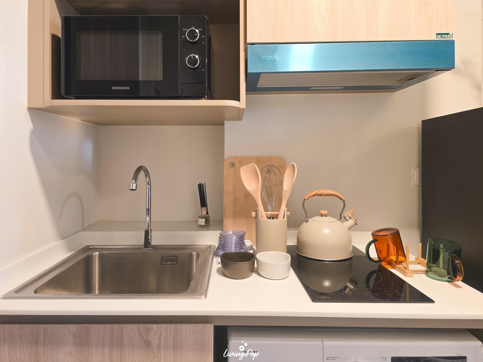 ชุดครัวจะ Built-in มาให้เหมือนกับห้องตัวอย่างเลยครับ เคาน์เตอร์ด้านล่างเก็บของได้ มีช่องสำหรับวางเครื่องซักผ้า เราจะได้ไม่ต้องเอาเครื่องซักผ้าไปวางที่ระเบียง ด้านบนก็เก็บของได้ ช่องวางไมโครเวฟก็ไม่สูงเกินไป นอกจากนี้ก็จะติดตั้งอ่างล้างจาน เตาไฟฟ้า และเครื่องดูดควันมาให้ด้วยครับ