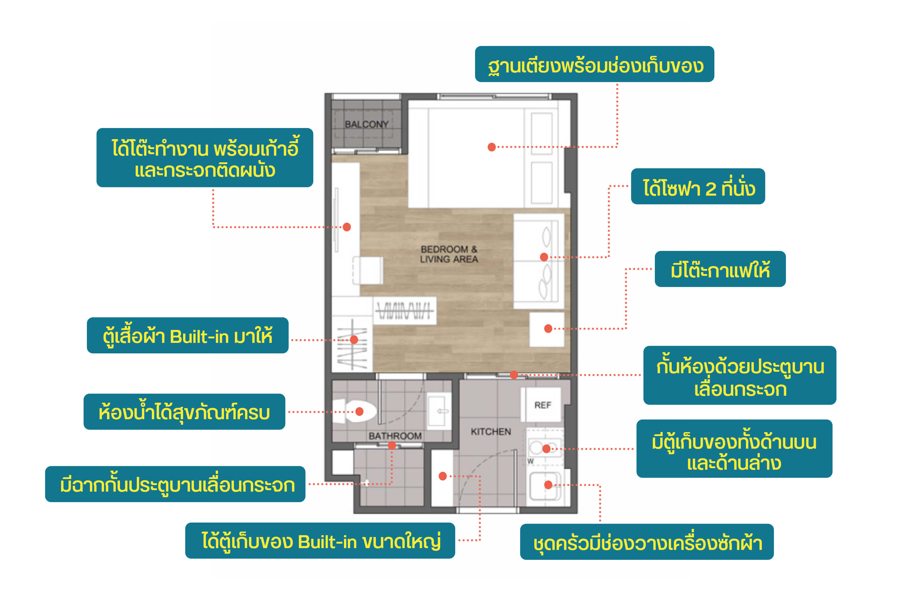 ส่วน Living Area ก็ได้ทั้งโซฟาขนาด 2 ที่นั่ง โต๊ะกาแฟ โต๊ะทำงานที่ปรับเปลี่ยนได้หลายฟังก์ชัน ใช้เป็นโต๊ะทำงานเฉยๆ หรือเป็นที่วางทีวีด้วยก็ได้ หรือจะทำเป็นโต๊ะแต่งหน้าก็ดีฮะ เขามีเก้าอี้กับกระจกมาให้พร้อมเลย ในโซนเตียงนอนก็จะมีฐานเตียง ด้านล่างมีลิ้นชักเก็บของ และปลายเตียงมีช่องให้ได้เก็บของเช่นกัน มุมแต่งตัวทำเป็น Walk-in Closet ที่ Built-in มาให้แบบพร้อมใช้งาน 2 ฝั่งเลย ส่วนห้องน้ำอ่างล้างหน้ามีตู้เก็บของ กระจกด้านหลังก็เก็บของได้ มีชักโครก สายชำระ ที่ใส่ทิชชู่ ราวแขวนผ้า ห้องอาบน้ำมีฝักบัว ชั้นวางของแบบเจาะผนัง และฉากกั้นประตูบานเลื่อนกระจกกั้นส่วนเปียกกับส่วนแห้ง นอกจากนี้ก็จะให้แอร์กับ Digital Door Lock ด้วยฮะ