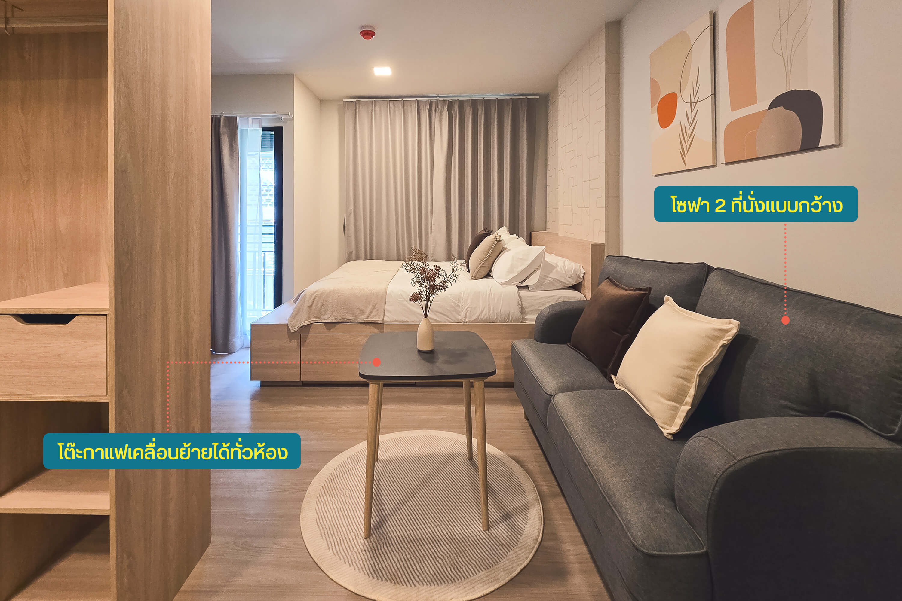 ทางโครงการขายห้องแบบ Fully Furnished ให้เฟอร์นิเจอร์มาแบบแน่นๆ เลยครับ เพราะเขาคิดมาแล้วว่าเฟอร์นิเจอร์แต่ละอย่างจะตอบโจทย์การใช้งานในชีวิตประจำวันของเราได้ยังไง และทำยังไงถึงจะรีดฟังก์ชันการใช้งานออกมาจากพื้นที่จำกัดให้ได้มากที่สุด