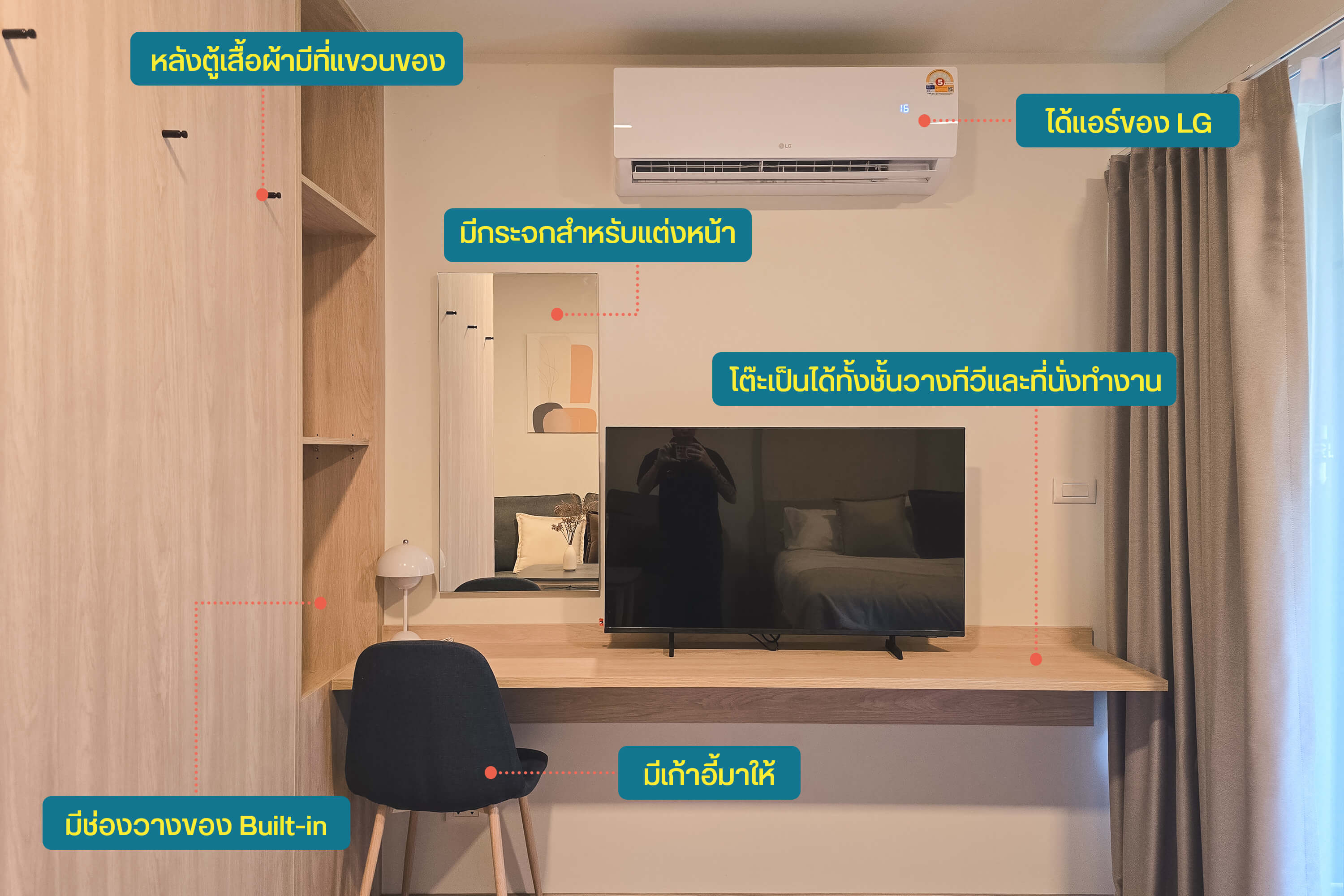 นอกจากนี้ยังมีโต๊ะแบบ Built-in เป็นโต๊ะยาวแบบอเนกประสงค์ วางทีวีได้ หรือทีวีจะติดที่ผนังแล้วเพิ่มพื้นที่เป็นโต๊ะทำงานก็ได้ ถ้าจะทำเป็นโต๊ะเครื่องแป้งก็มีกระจกติดตั้งมาให้เช่นกัน เก้าอี้มีมาให้ นอกจากนี้ตู้เสื้อผ้าฝั่งที่เป็นห้องนั่งเล่น ยังทำเป็นชั้นวางของให้เราได้อีก มีราวแขวนติดตั้งมาให้ 3 อันด้วย