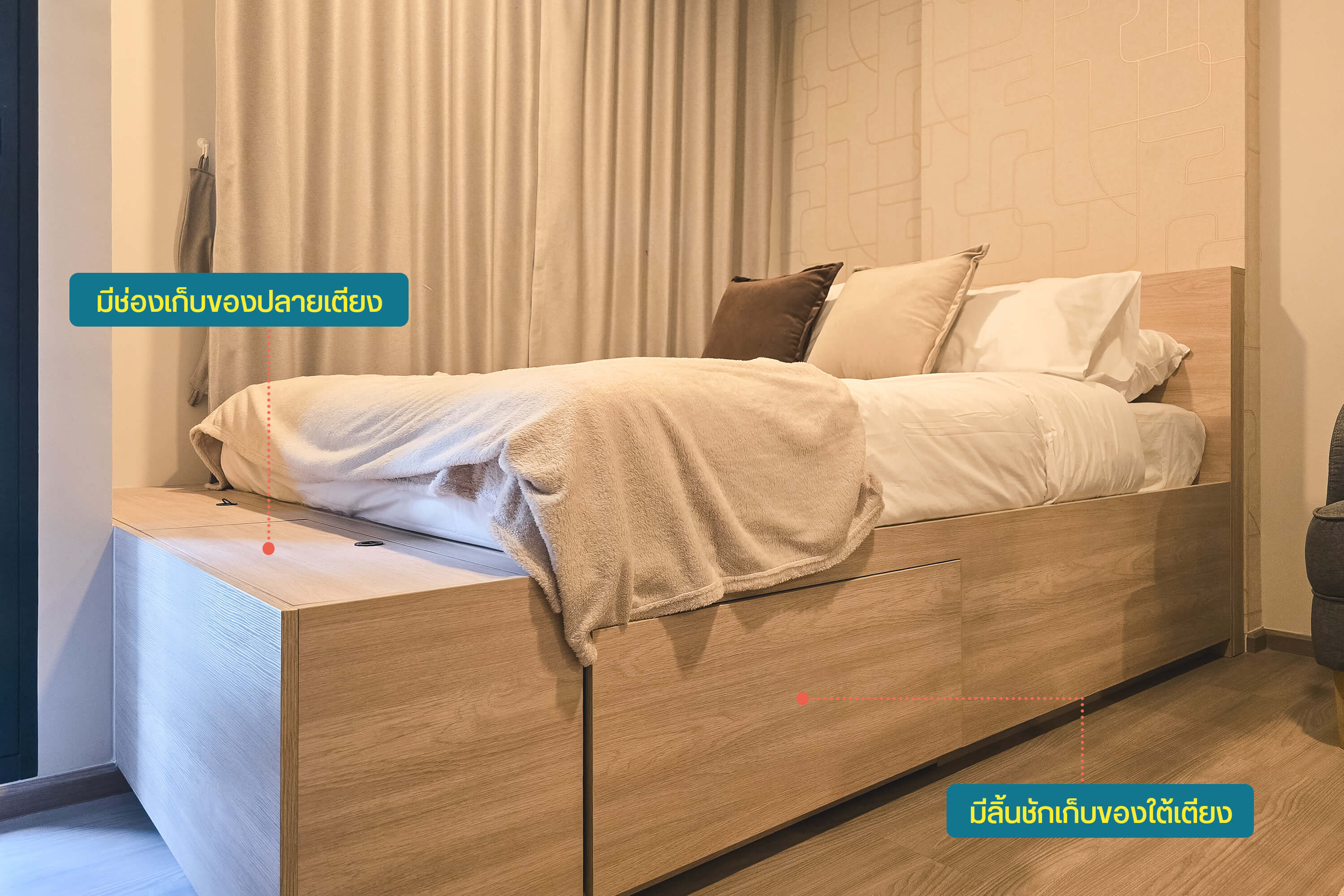 ทางโครงการจะให้ฐานเตียงมาด้วย ตัวฐานเตียงค่อนข้างสูง เพราะด้านล่างเขาทำเป็นช่องเก็บของฮะ อย่างตัวลิ้นชัก จะเป็นล้อที่ลากออกมาได้อย่างอิสระ ส่วนปลายเตียงก็เป็นที่เก็บของด้านใน แค่เราเปิดขึ้นมาก็ใส่ของได้อีกเยอะเลย