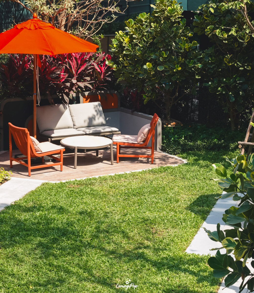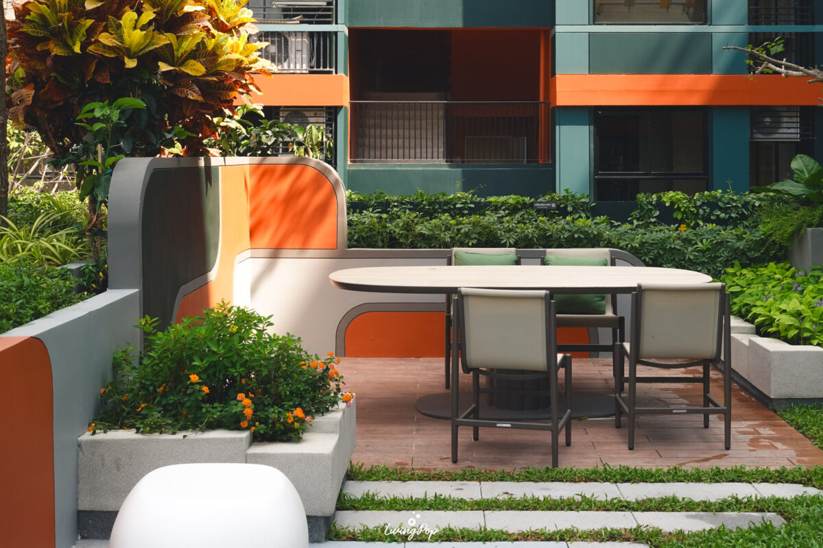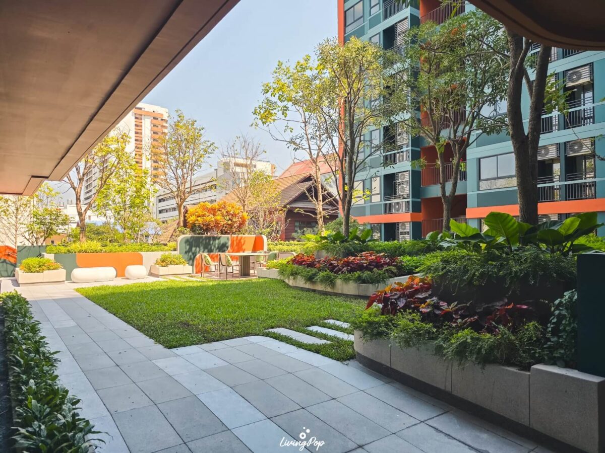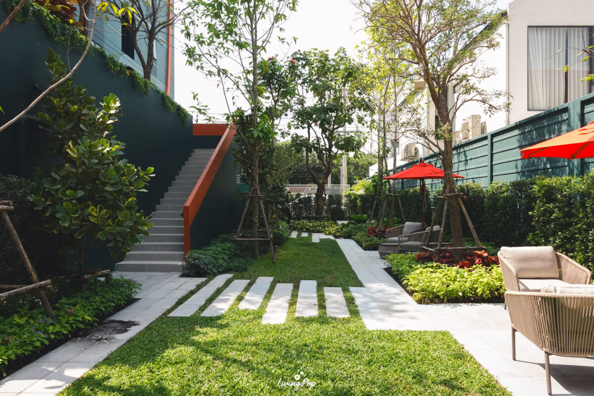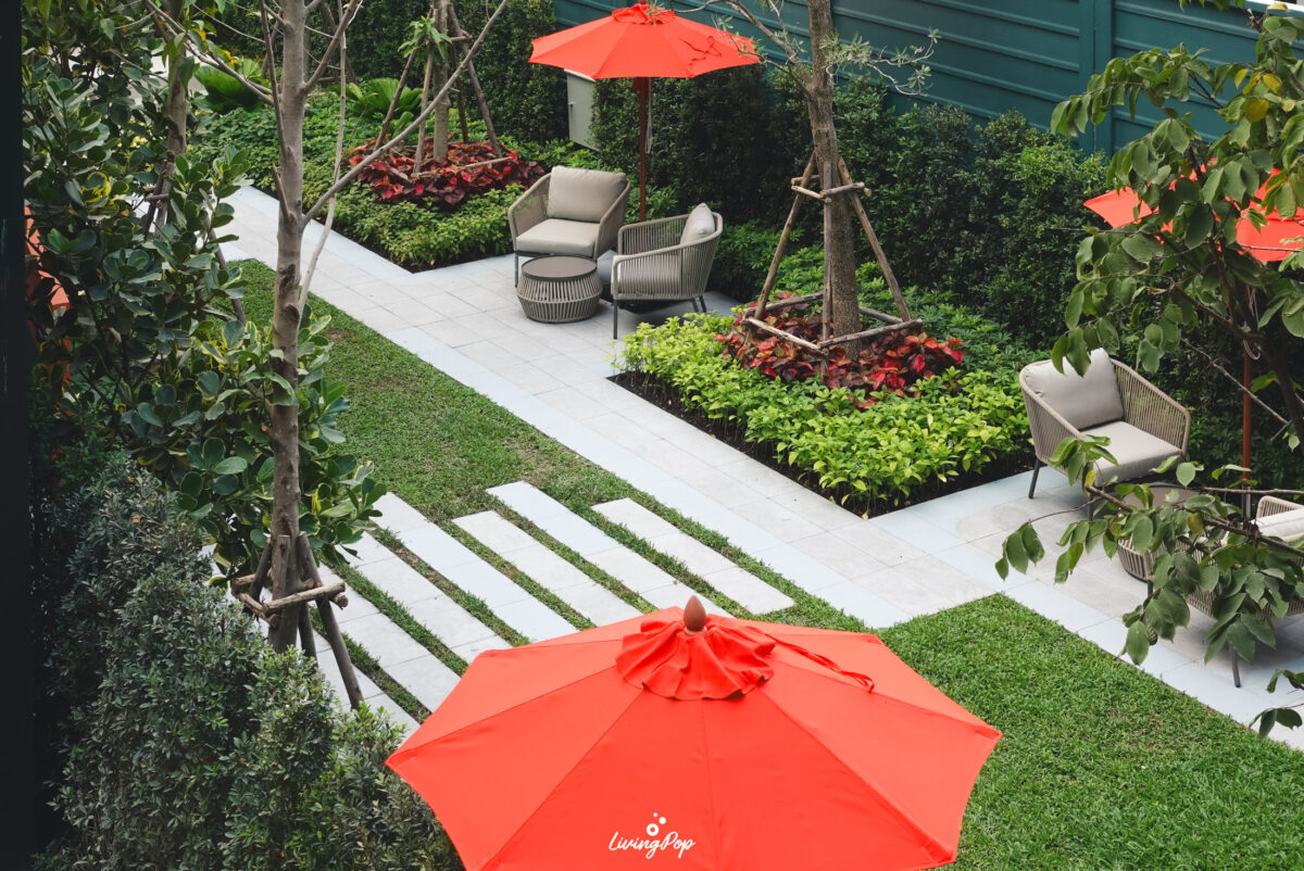 เดินมาหน่อยก็จะเจอสวนสีเขียวแบบนี้เลย ส่วนใหญ่จะเป็นไม้พุ่มครับ ต้นไม้จะตั้งโดดเด่นอยู่หนึ่งต้น โอบล้อมไปด้วยบาร์และพื้นที่นั่งเล่น ส่วนด้านข้างจะเป็น Sansiri Backyard สวนที่ต้องมีในทุกโครงการของแสนสิริ เอาไว้ปลูกพืชผักสวนครัวครับ เป็นสวนที่ใช้กินก็ดี มาพักผ่อนก็ได้เช่นกัน