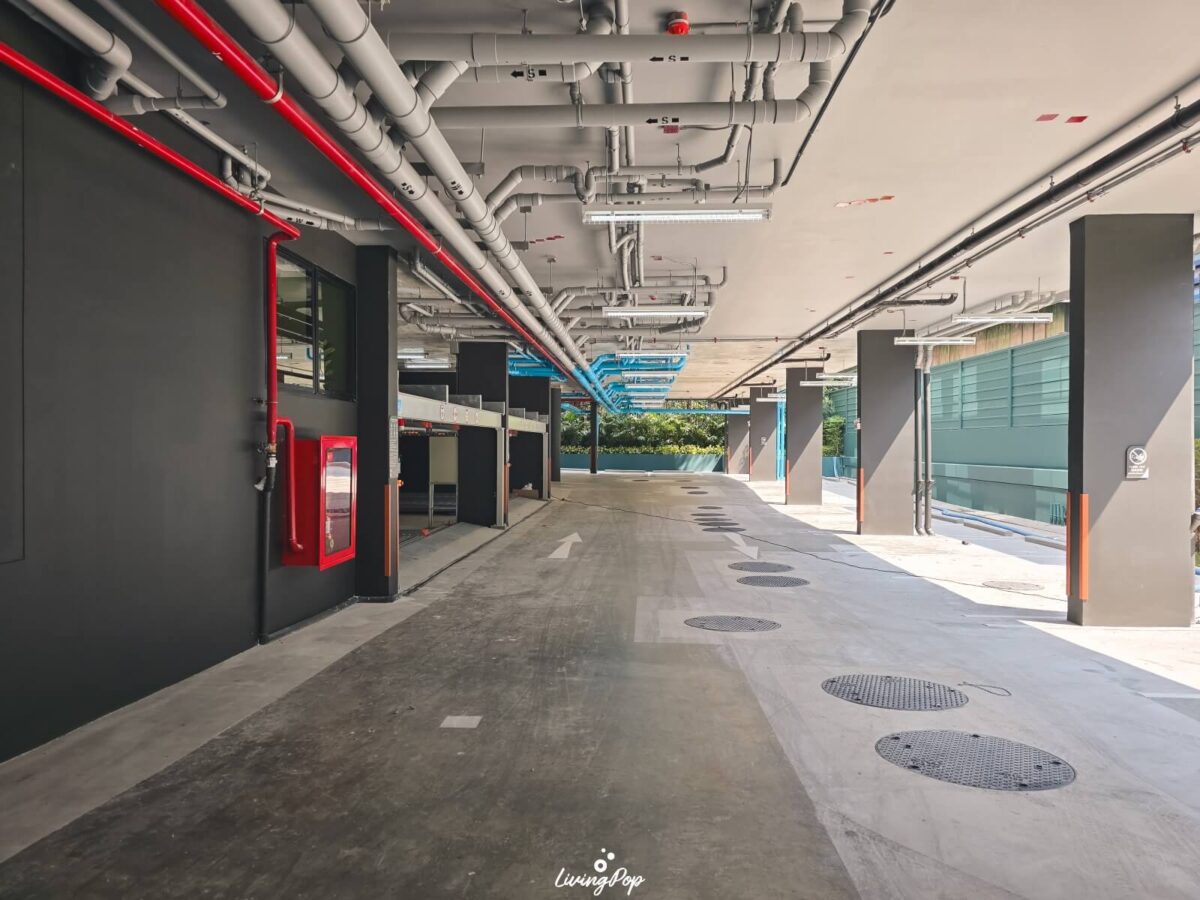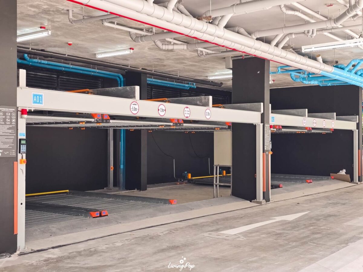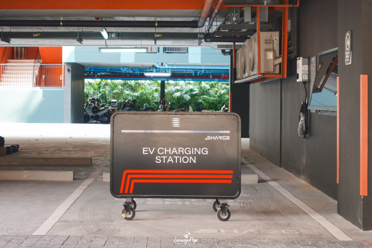 ลานจอดรถจะอยู่รอบบริเวณชั้น 1 เลย มีจำนวนที่จอดทั้งหมด 31% ครับ จะมีฝั่งที่เพดานสูงด้วย ฝั่งนี้จะใส่ Mechanical Parking ได้ ก็จะทำให้ลูกบ้านมีที่จอดรถมากขึ้น ที่นี่จะมีที่จอดรถสำหรับ EV Charger 1 ที่ เป็นตู้ของ SHARGE ครับ นอกจากนี้ก็จะมีที่จอดสำหรับผู้พิการอีกหนึ่งจุด