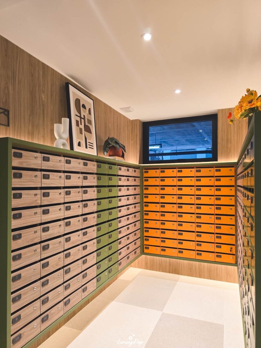 จุดที่รับพัสดุ/อาหาร จะอยู่ด้านหน้าติดกับห้องนิติบุคคล ใกล้กับ Lobby เลย ขนส่งหรือไรเดอร์ไม่ต้องขับเข้าไปไกล แล้วเราเองก็ไม่ต้องเดินออกมาเอาไกลเช่นกัน