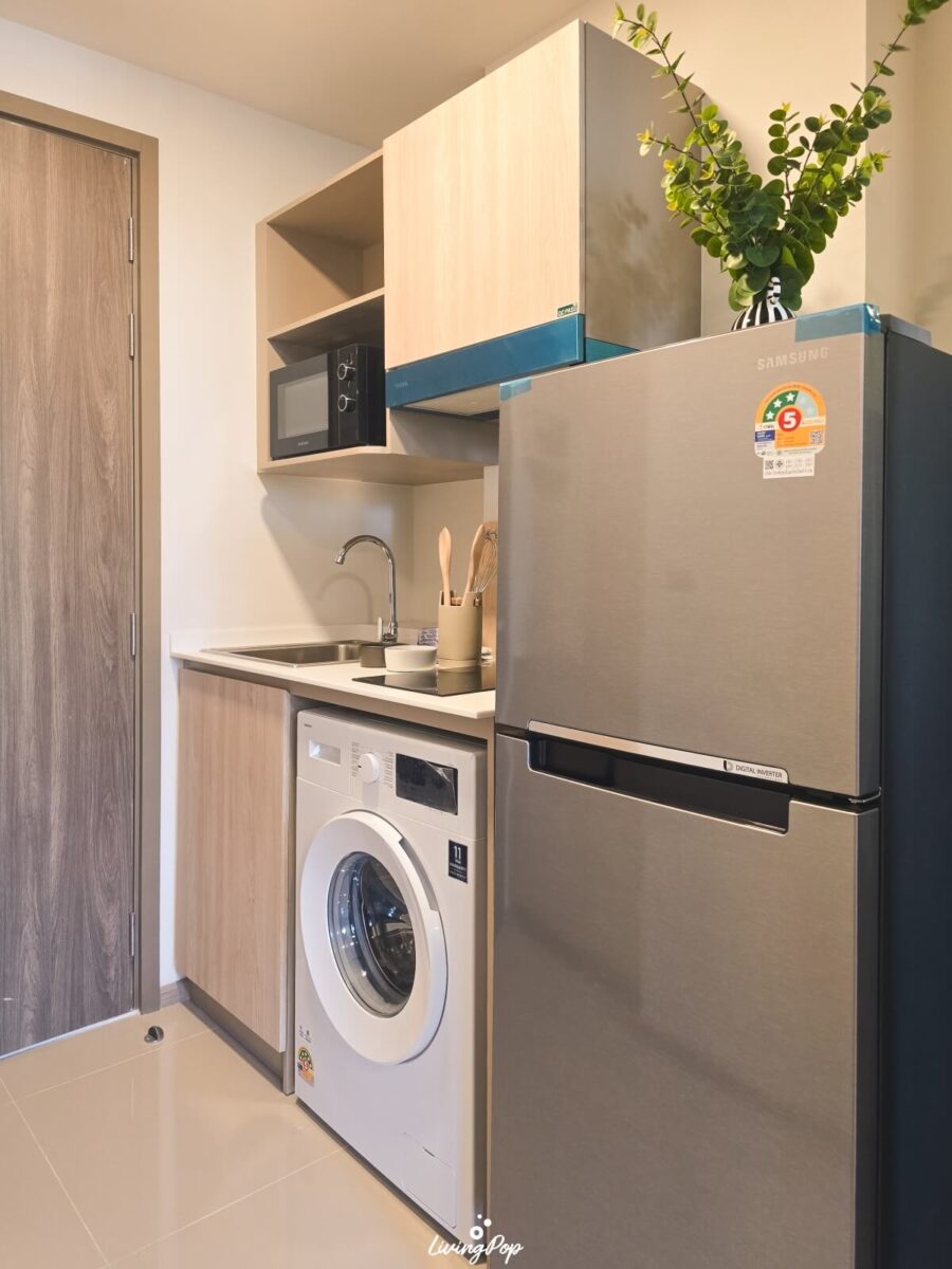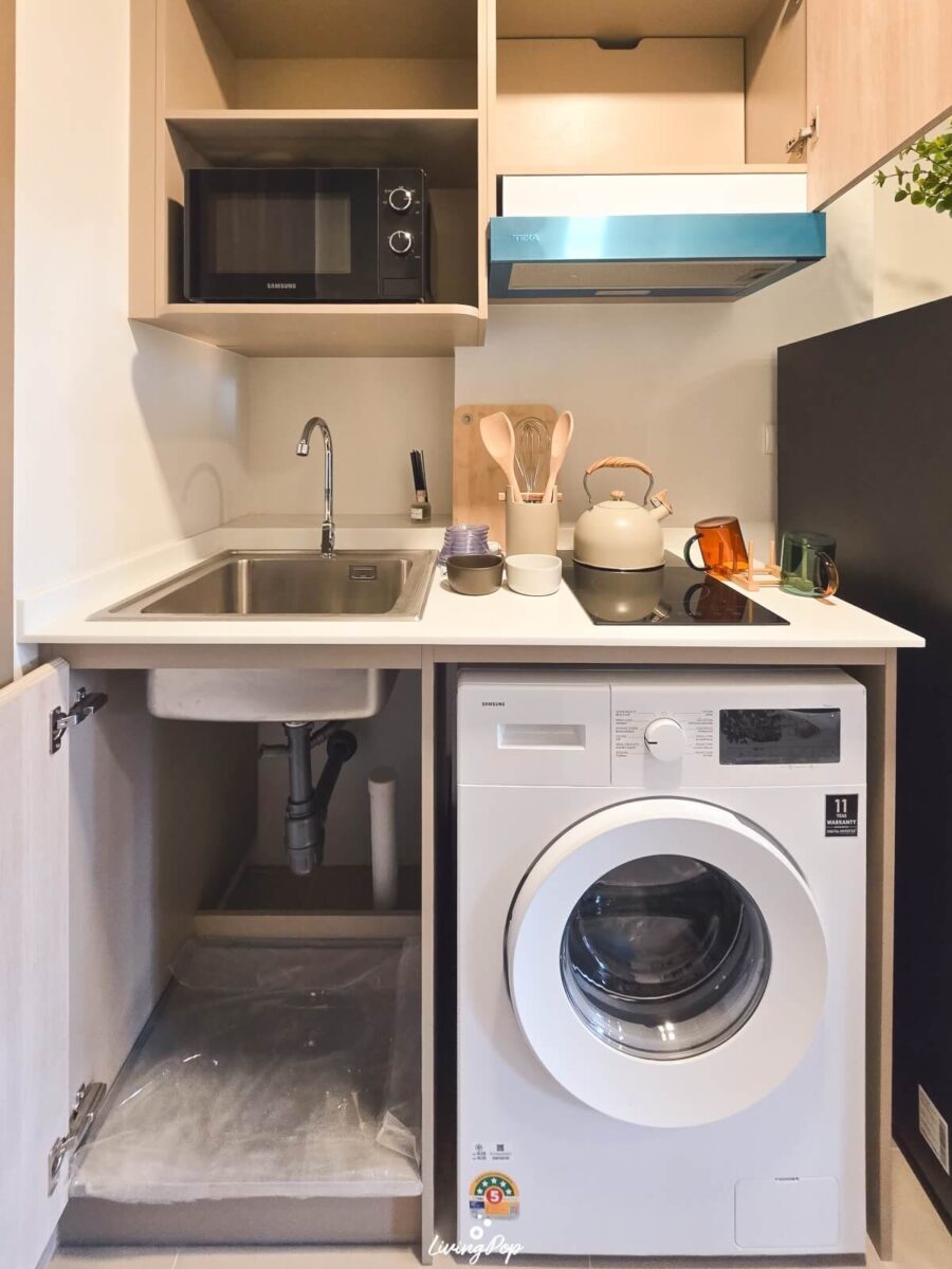 อย่างห้องครัว ก็มีชุดเคาน์เตอร์ครัว อ่างล้างจาน เตาไฟฟ้าและเครื่องดูดควันมาให้ นอกจากนี้ยังมีตู้เก็บของแบบ Built-in ด้วย ด้านล่างก็วางเครื่องซักผ้าได้ ด้วยความที่ขนาดห้องไม่ได้ใหญ่ แน่นอนว่าระเบียงก็ไม่ใหญ่ตามไปด้วย ดังนั้นการวางเครื่องซักผ้าในครัว ก็จะทำให้เราใช้พื้นที่ระเบียงทำอย่างอื่นได้อย่างเต็มที่ เช่น การทำสวนเล็กๆ ตากผ้า หรือการวางเก้าอี้เอาไว้นั่งเล่นชิลๆ