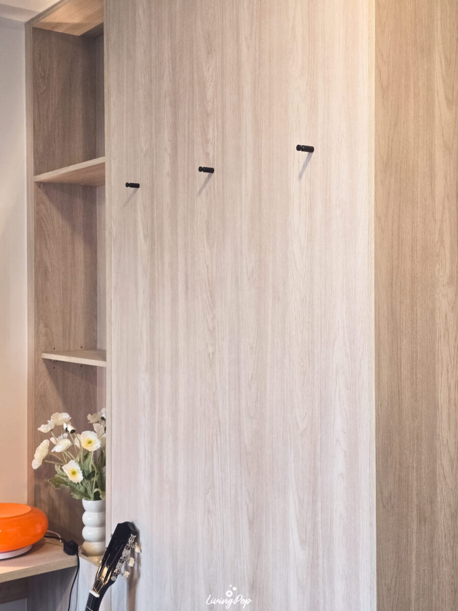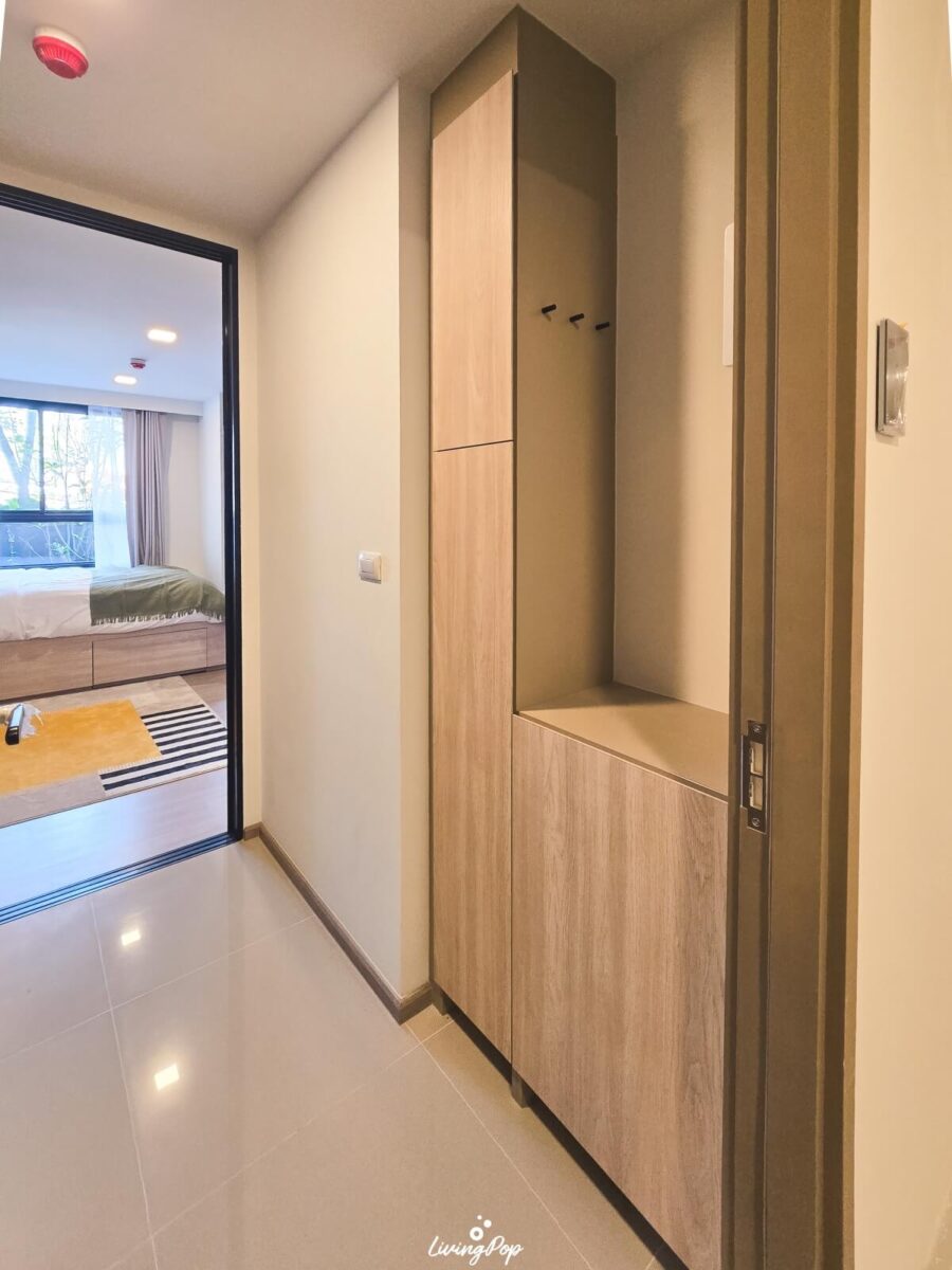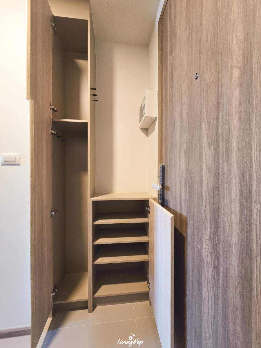 สำหรับโถงทางเข้า เปิดมาก็จะเป็นครัวครับ แต่ฝั่งตรงข้ามครัว ทางโครงการเขา Built-in ตู้เก็บของมาให้เราแล้ว ซึ่งเป็นช่องพอดีกับตัวห้องเลย ตู้นี้เป็นทั้งที่เก็บรองเท้า และของใช้ต่างๆ ได้ อย่างถ้าเรามีไม้กวาด ที่ตักผง เครื่องดูดฝุ่นหรือเตารีดต่างๆ เพื่อไม่ให้รกห้อง เราสามารถเอามาใส่ในตู้นี้ให้ดูเป็นระเบียบได้ ด้านบนตู้รองเท้า เราก็สามารถใส่ของที่เราใช้ประจำก่อนจะออกห้องได้ อย่างพวกกุญแจรถ คีย์การ์ด บัตรพนักงาน กระเป๋าเงิน หรือเครื่องประดับต่างๆ ด้านข้างตู้เขามีที่แขวนมาให้ด้วย เผื่อเราห้อยพวกพวงกุญแจ ผ้า หมวก หรือกระเป๋าต่างๆ ได้